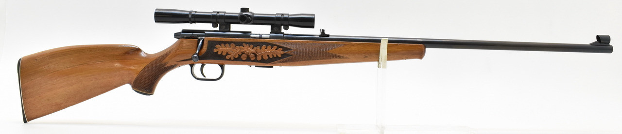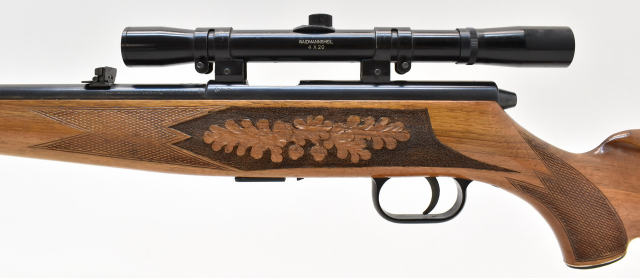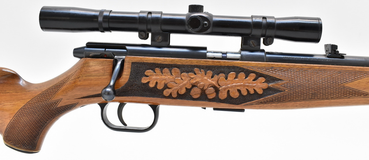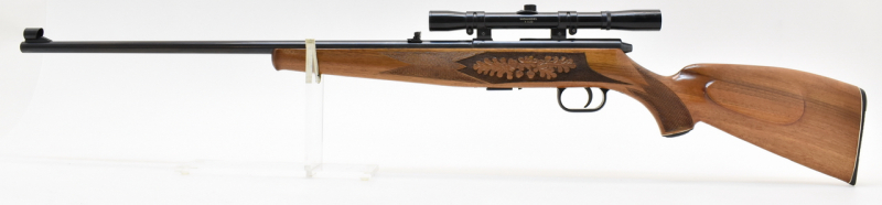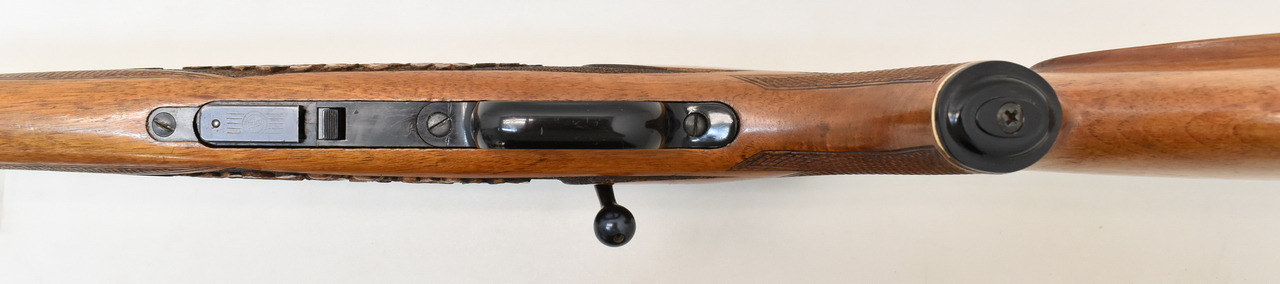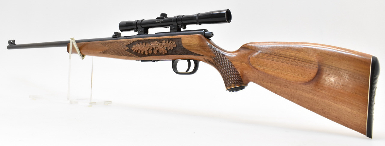KK Repetierer von der Firma Kriegeskorte&Co., Stuttgart. 5-Schuss Magazin, Druckpunktabzug. Spiegelbanker Lauf, 350mm langer Schaft (gemessen Abzug bis Mitte Schaftkappe). Es fehlen Riemenbügel. Montiert mit einem Waidmannsheil ZF 4x20 Abs. 1 mittels Festmontage.