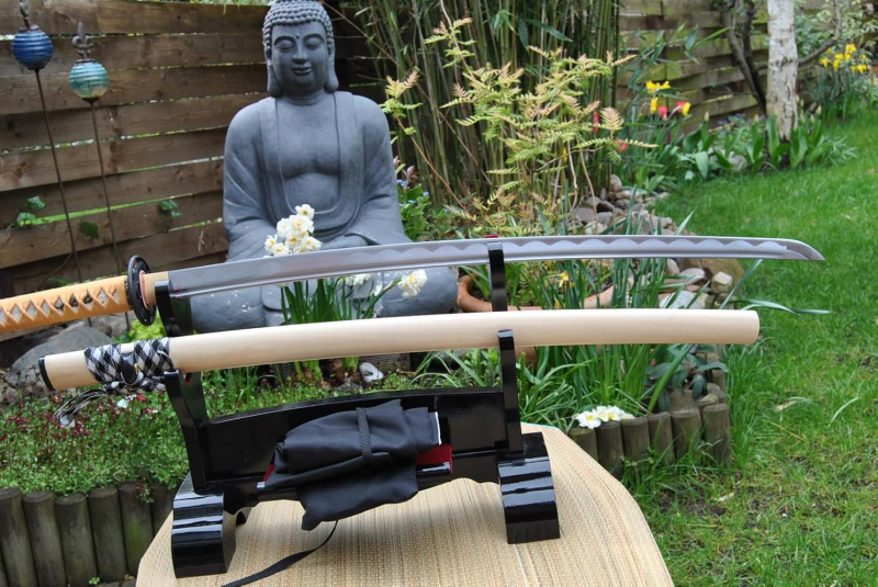 Wunderschöne Handgeschmiedete Katana Samurai Schwert aus aller besten Stahl 1045 die durch das harmonische Zusammenspiel mit Saya und Tsuka zu einem vollkommenen Kunstwerk gemacht wurde. Das Schwert wird mit Schwertbeutel geliefert. Die gesamte Länge des Schwertes ist 104cm, die Klingenlänge 73cm und der Griff ist 28cm lang.Klingenbreite: 3,2 cm cm Klingenrücken: 8 mm Die Saya ist Schwarz lackiert. Die Zubehörteile haben ein Tanaka Samurai Design und sind aus Metall, der Habaki ist aus massiven Messing. Der Griff ist aus Holz und in Rochenhaut eingelegt.Dieses Schwert ist nicht nur ein Kunstwerk das in höchstem Maße dekorativ ist, sondern es ist auch scharf und vollkommen geeignet für echte Kämpfe und Schnittübungen. Die Klinge besitzt eine BO-HI.Die Klinge ist, zwecks Größerer Sicherheit, mit zwei mekugi (Bambus Zapfen) befestigt. .Ohne Ständer