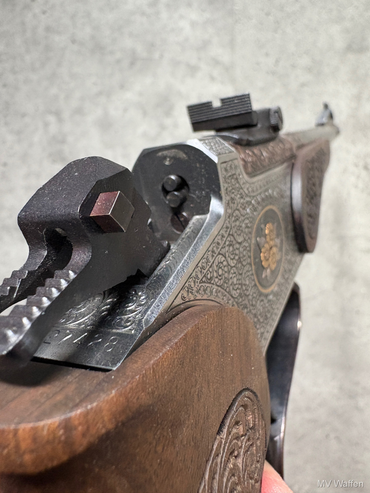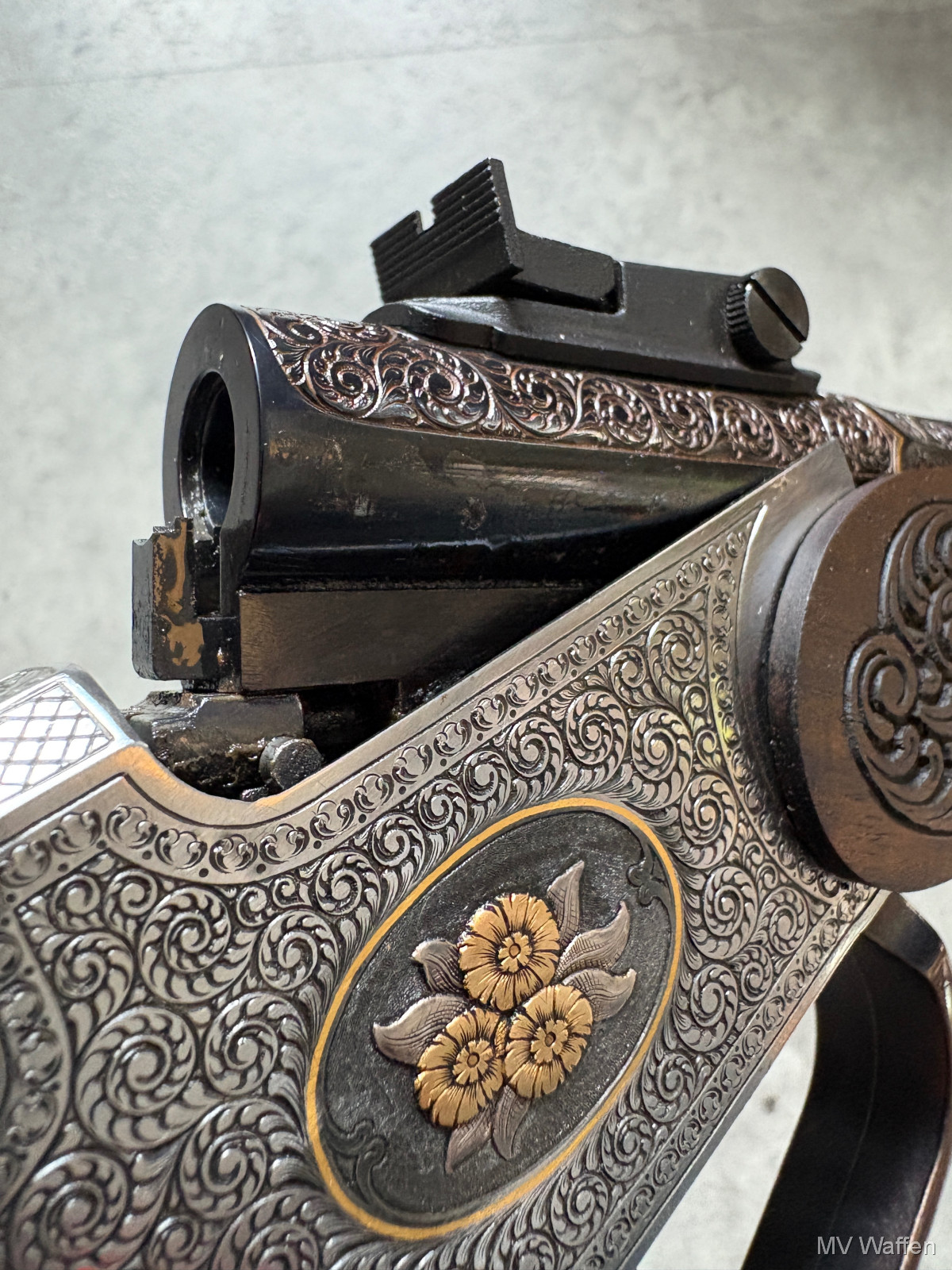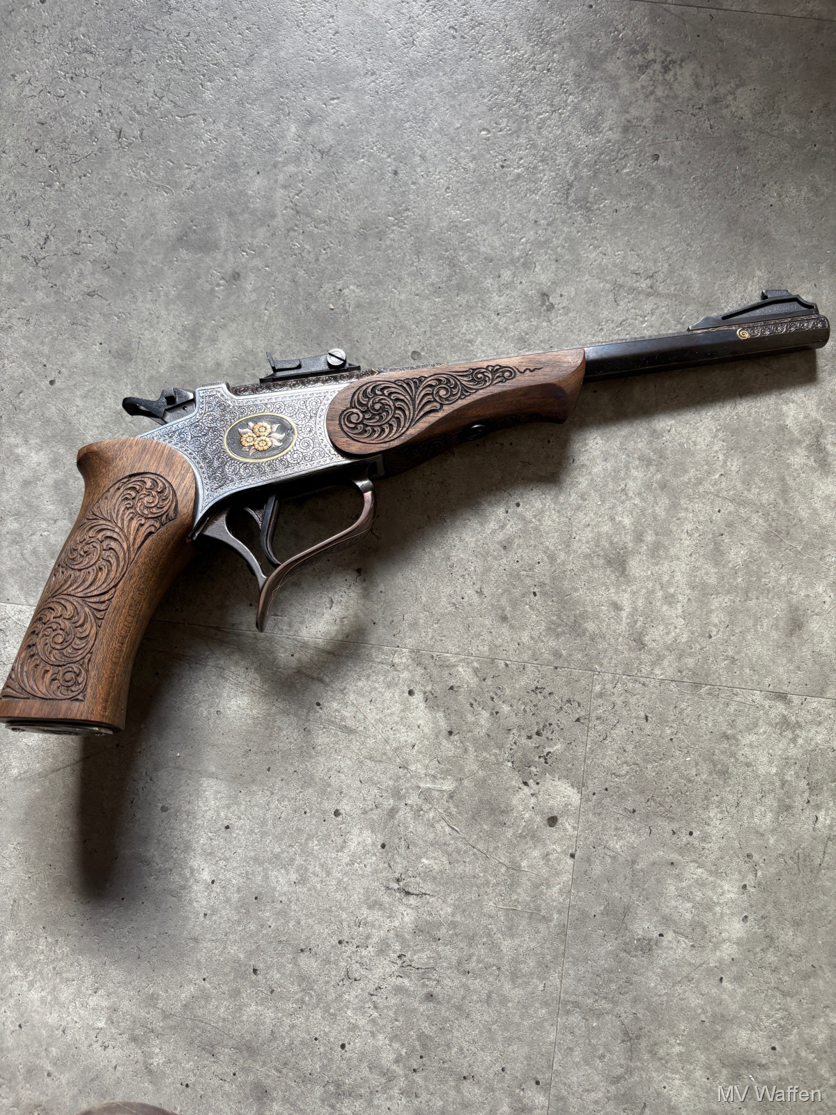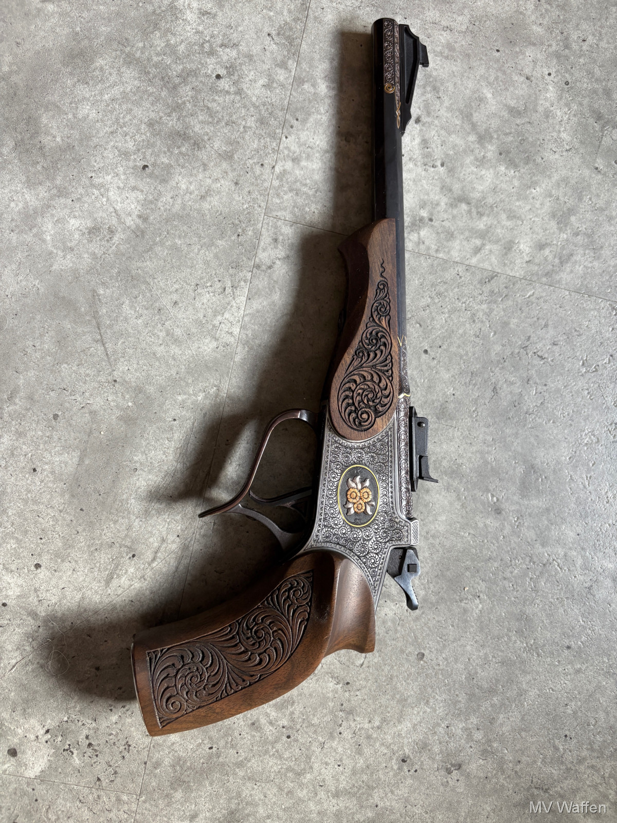 Wunderschön reich gravierte Thompson Contender im Kaliber .38 SP. Ein wirkliches Kunstwerk. Hat keinen Beschuss, ist zum Schiessen allerdings auch viel zu schade. Eine wirklich Traumhafte Waffe. Züge und Felder scharf. Komplette Funktion gegeben. Sehr guter Zustand. Direktversand an Europäische Händler möglich. Fragen Sie bitte nach den Versandkosten. Wie immer völlig unbearbeitet um Ihnen einen ehrlichen Eindruck des Zustandes zu ermöglichen.. Diese Sammelwaffe kann natürlich gerne, nach vorheriger Absprache in Wolfratshausen besichtigt werden
