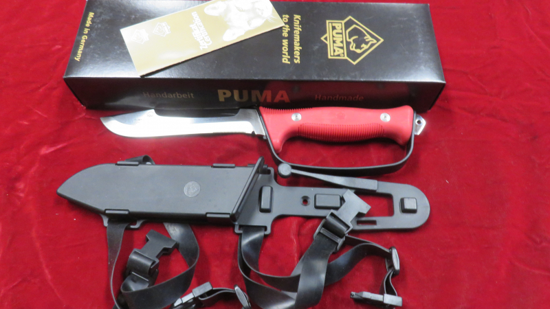 1 Originales Puma Tauchermesser " Puma SEAHUNTER " das Messer ist neu und unbenutzt, roter Griff, mit Puma Pappkarton, Puma Zertifikat, Klingenlänge: 15 cm. Spezial Messerscheide für Taucher.