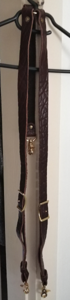Handgefertigte Hosenträger aus entweder Bison oder Rindsleder mit verstellbaren Applikation aus massivem Messing, der Firma CORNO D'Oro, zumindest wurden die Hosenträger in einem Beutel mit dieser Firmen Bezeichnung gefunden und diese Firma bietet online diverse handgefertigte Leder Waren im höheren Preissigment an. Die Hosenträger kann man als neuwertig bezeichnen, Rest siehe Fotos.