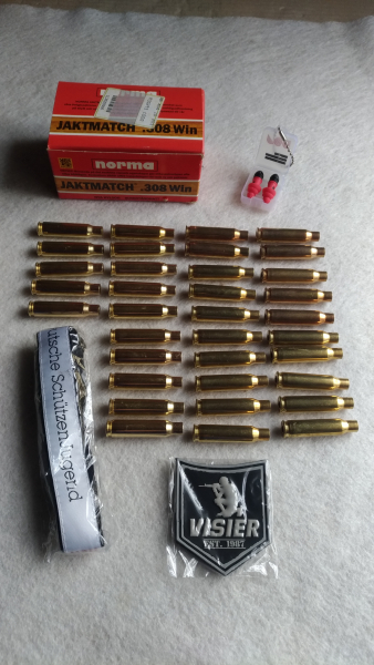 | Biete Konvolut von 54 Stück Hülsen Kaliber .308 WIN (35 NORMA, 5 Geco, 10 S&B, 4 FC) mit Allem was auf den Bildern zu sehen ist an (Band mit Karabiner zum Umhängen, 2 Ohrstöpsel und ein Visieremblem mit Klettaufsatz). Die Hülsen wurden mit einer RCBS Kalibriermatrize entzündert, voll kalibriert und danach nass mit Ultraschall gereinigt. Die Hülsen sind einmal abgefeuert und nicht wiedergeladen, können aber aus verschiedenen Losen sein. Dies ist ein Privatverkauf, daher sind Garantie und Rücknahme ausgeschlossen. Versicherter Versand erfolgt mit Hermes und nur innerhalb Deutschland. Trackingnummer wird per E-Mail mitgeteilt.