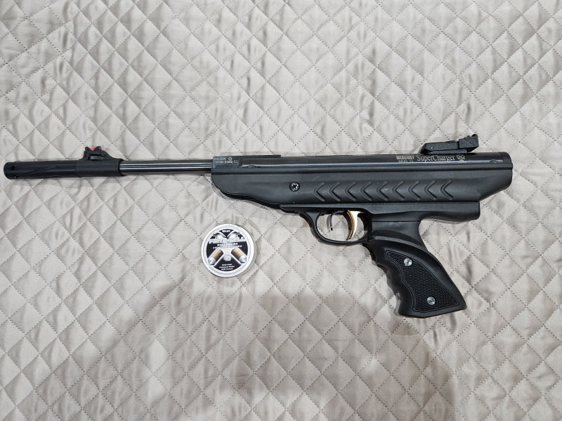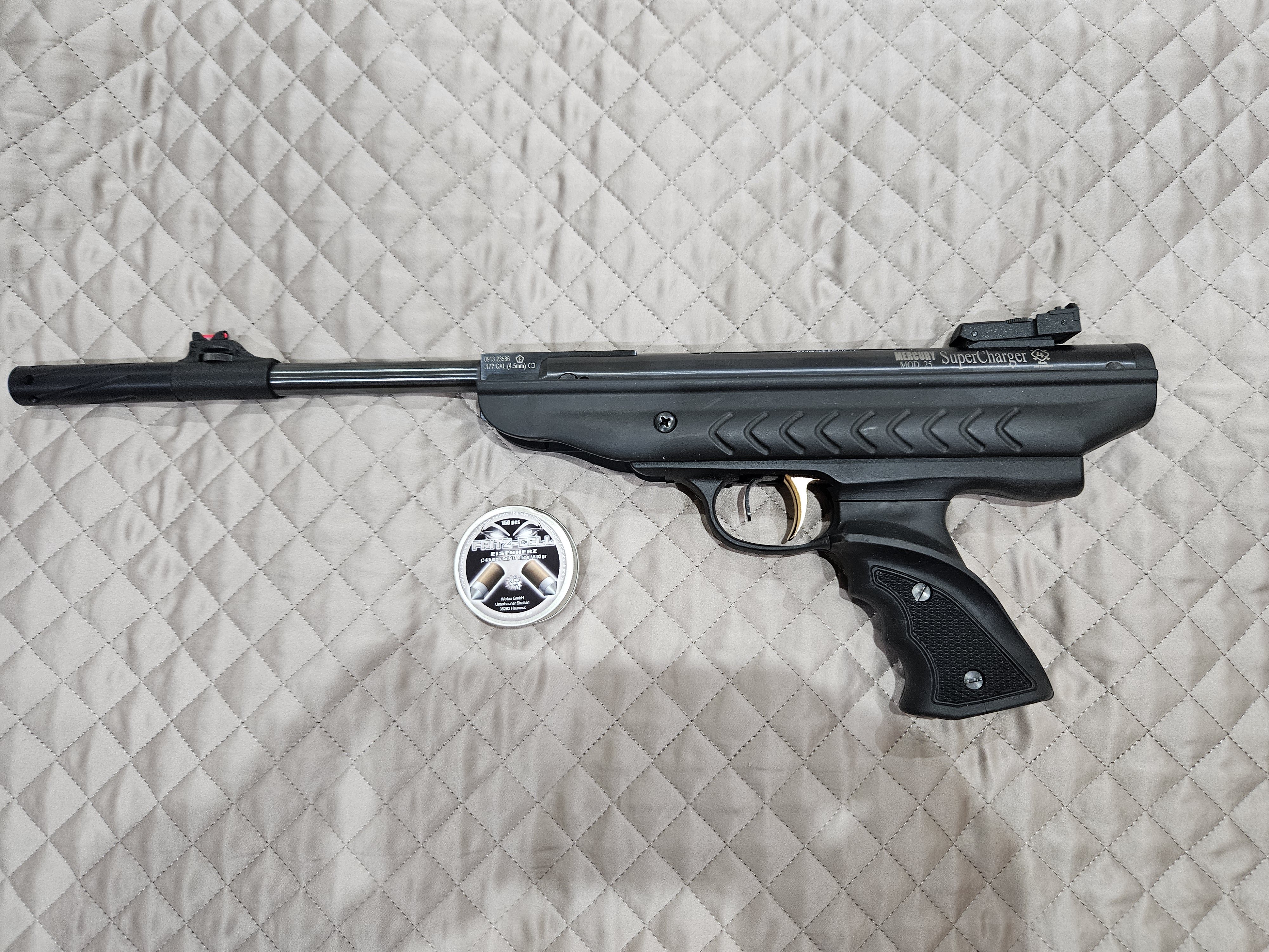 Biete wie auf den Bildern zu sehen eine absolut neuwertig Luftpistole der Marke Mercuri Super Carger in 4,5mm 7,5 J an.Mit Schalldämpfer