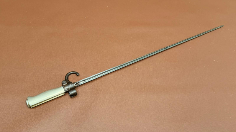 📖 Beschreibung Bajonett M1886 Lebel, Seriennr. 10194 Zum Verkauf steht ein originales Tüllenbajonett M1886 für das französische Lebel-Gewehr. Die lange, schlanke Klinge (52 cm) und die markante Parierstange verleihen dem Stück eine sehr präsente Erscheinung. Die Weißblechgriffschalen zeigen altersbedingte Gebrauchsspuren und Patina; alle Stempelungen sind auf den Bildern gut dokumentiert. Seriennummer 10194 auf der Parierstange vorhanden. Ideal für Sammler historischer Blankwaffen oder als Anschauungsstück in einer Militaria-Sammlung. Bitte die Fotos genau ansehen — Zustand und Details sind dort am besten erkennbar. Versand erfolgt sicher verpackt, Abholung möglich.