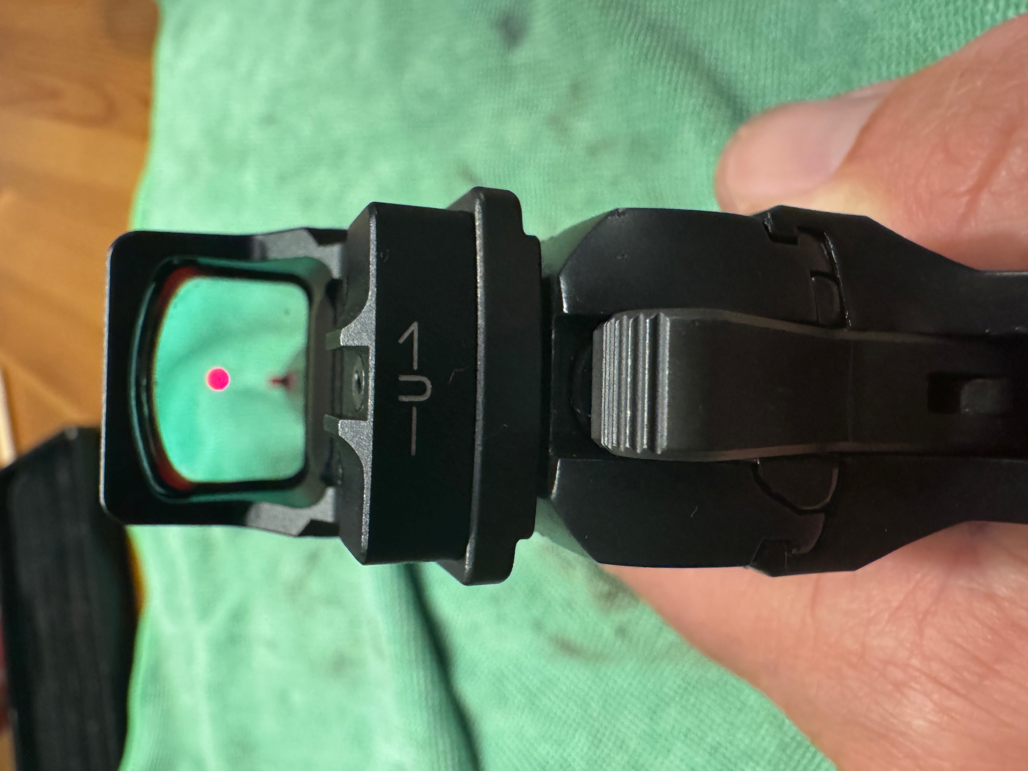 Insgesamt würde ich auf ca. 2000-2500 Schuss tippen, die die Waffe gesehen hat, mehr nicht, ich habe sie nur selten benutzt. Das Reddot ist erst wenige Wochen montiert. Das Reddot hat 3 Einstellungen für den Punkt und auch mehrere Helligkeitsstufen. Das kann man leider schlecht fotografieren.