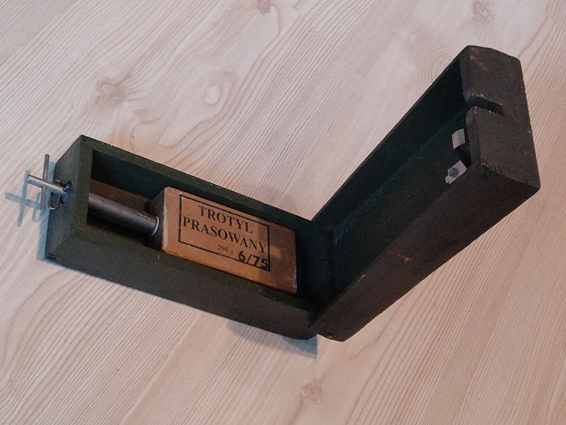 Der 200g Trotyl-Sprengkörper ist eine Reproduktion aus Holz und Wachspapier.