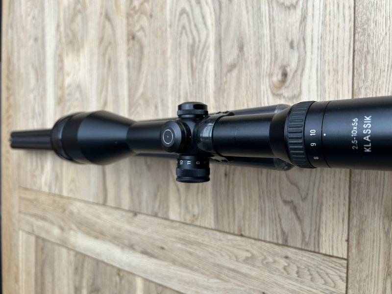 Zielfernrohr: Schmidt & Bender Klassik 2,5–10×56, feines L3-Leuchtabsehen (entspricht Absehen 60), erste Bildebene, 11 Leuchtstufen.