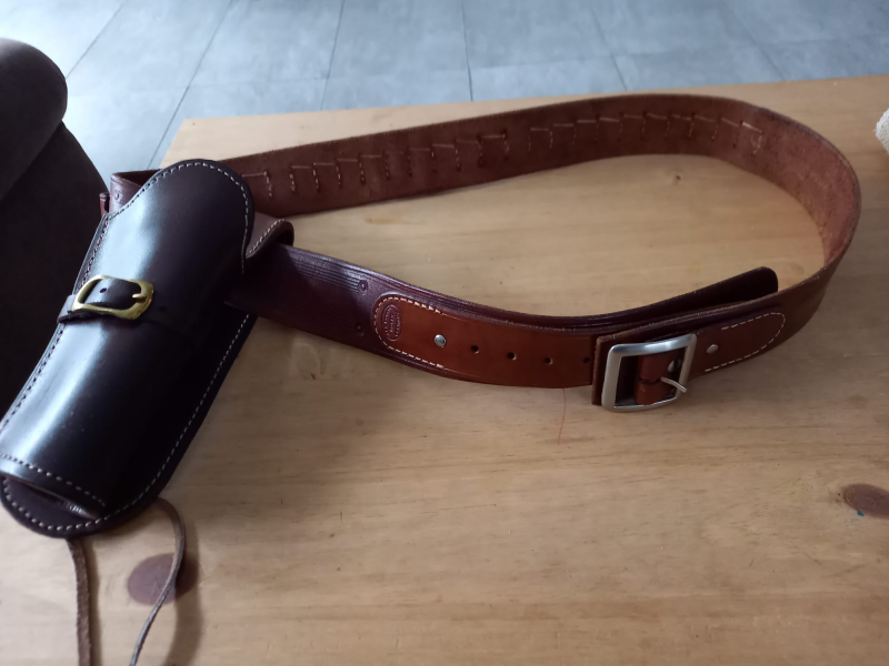 Verkaufe mein Rig im neuwertigen Zustand, Gesamtlänge beträgt 127 cm , bis zum 1 Loch 122 cm und zum letzten 108,5 cm. Der Gurt hat 28 Patronenschlaufen, die Patronen im Gurt sind Cal. .45 Colt und DEKO natürlich.