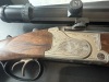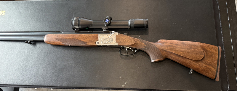Krieghoff Bockbüchsflinte Ultra,kleine Jagdstückgravur, rechts Ente, links Rehbock, Ansichtseite, 2 Stecher, Handspannung, Cal 7x57R- 12/70, mit Einstecklauf 5,6x52R (Keppeler)VVV von vorne verstellbar ,