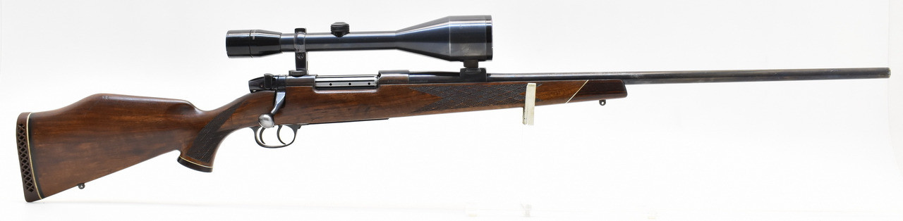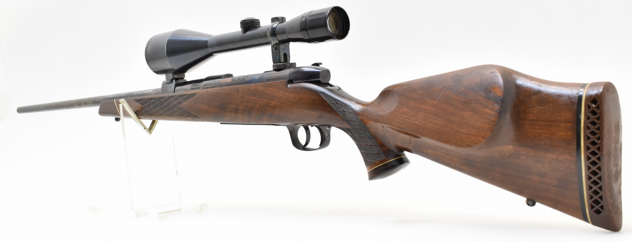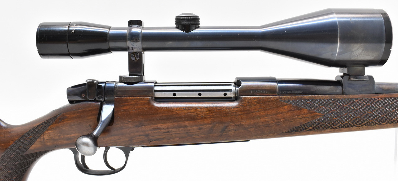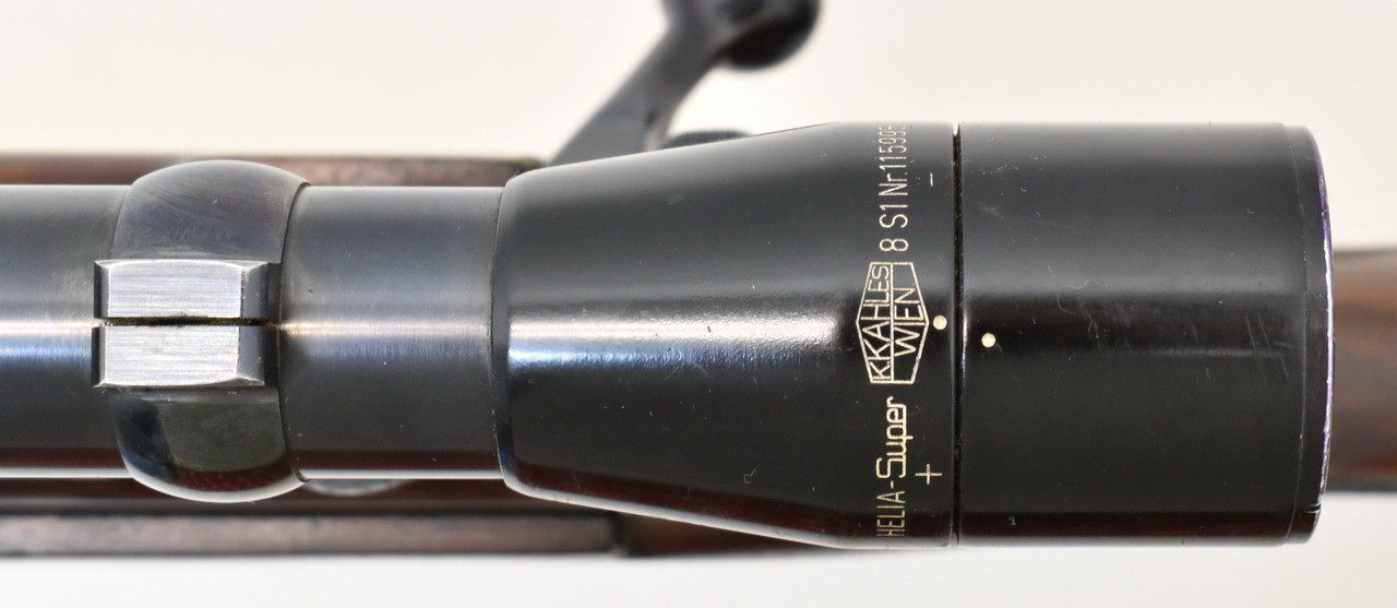 Repetierer aus Sauer Fertigung mit deutschem Stecherabzug und seitlicher Sicherung. Spiegelblanker Lauf, stark beriebene Brünierung. Montiert ist ein Kahles Helia Super Zielfernrohr 8x56 Abs. 1. 35,5cm langer Schaft mit Backe und Pistolengriff. ( gemessen vorderer Abzug bis Mitte Schaftkappe)