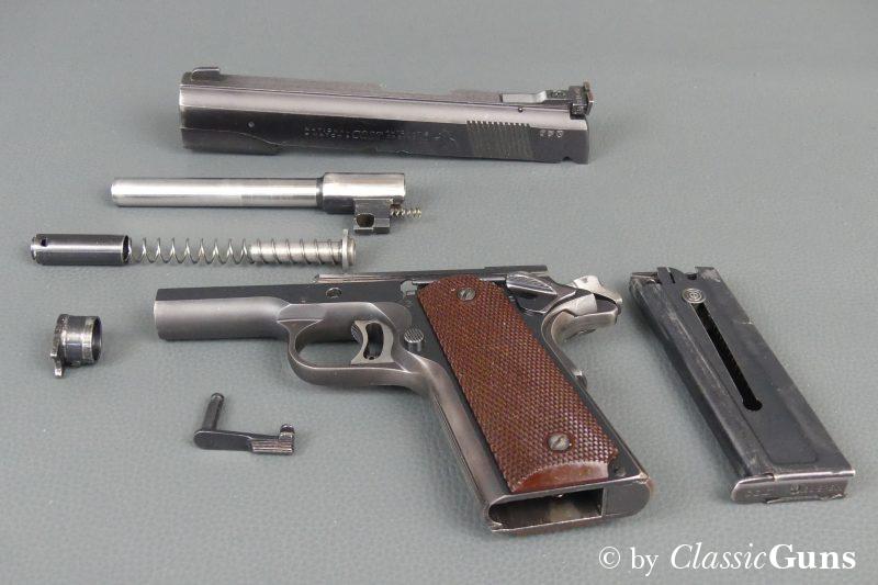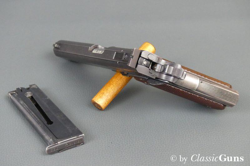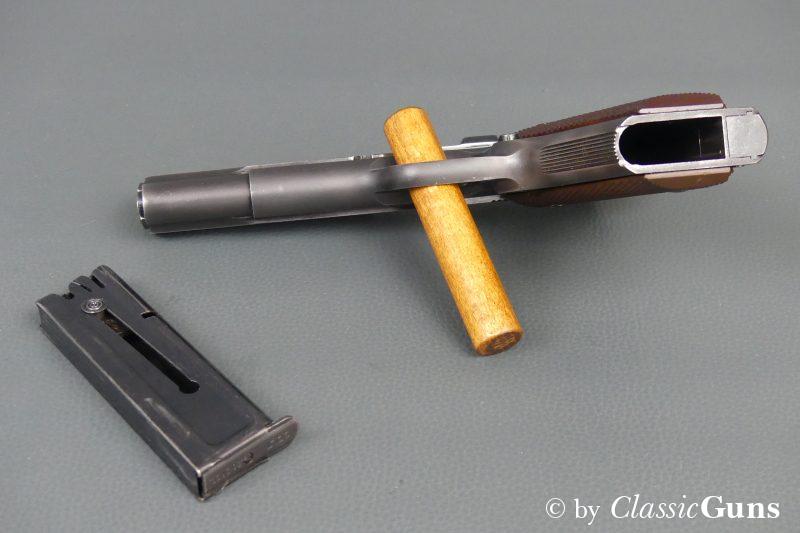 5“ Lauf mit neuwertigem Zug-/ Feldprofil. Brünierung mit moderaten Gebrauchs- und Handhabungsspuren. Feder-/Masseverschluss, SA-Abzug mit Trigger Stop, Elliason-Mikrometervisier, erstklassig erhaltene Kunststoffgriffschalen und erstklassig erhaltenes Magazin.