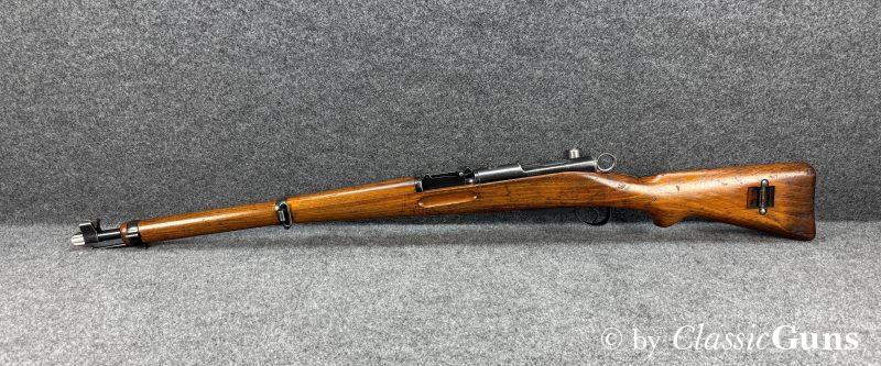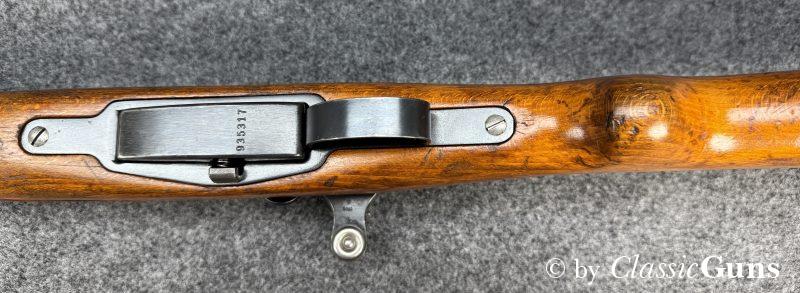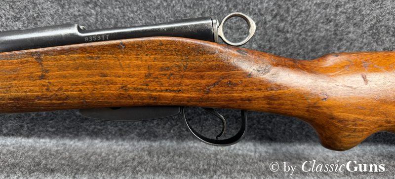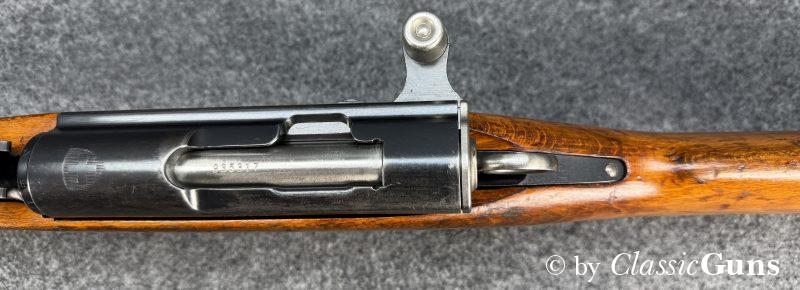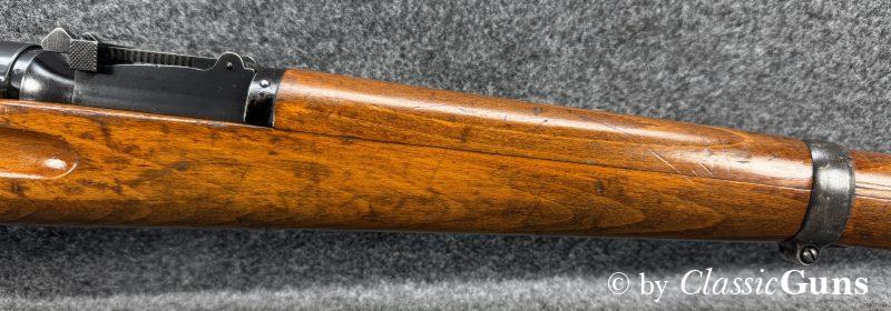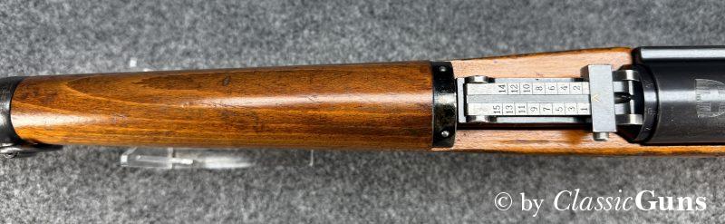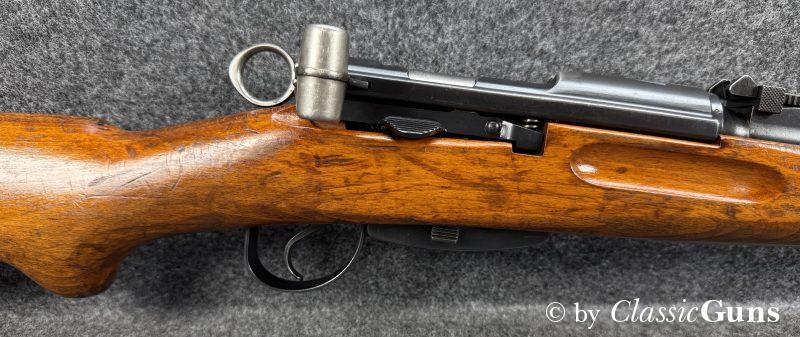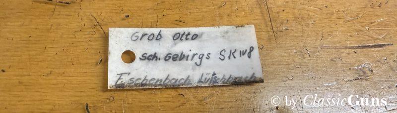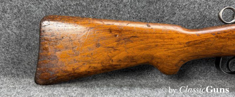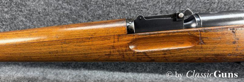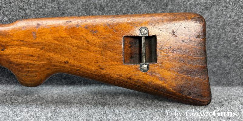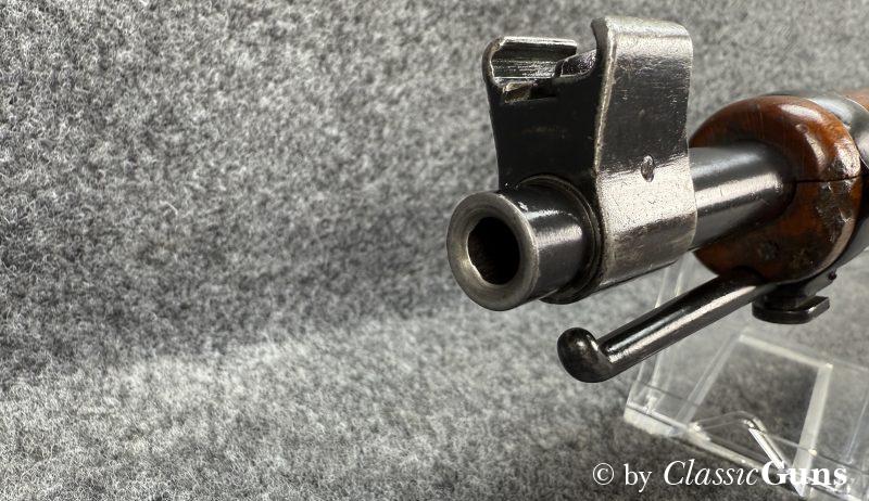 Die komplett nummerngleiche Waffe verfügt über einen Lauf mit erstklassigem Zug-/ Feldprofil. Die Brünierung und Schaft weisen moderate Gebrauchsspuren einer militärisch geführten Waffe auf. Unter der Schaftkappe befindet sich, wie so oft bei diesen Waffen, der handschriftliche Eigentumszettel des ursprünglichen Besitzers (siehe letztes Foto). Sicherlich ein interessanter Ansatz zu weiteren Recherchen. Zum Lieferumfang gehört der originale Mündungsschutz.