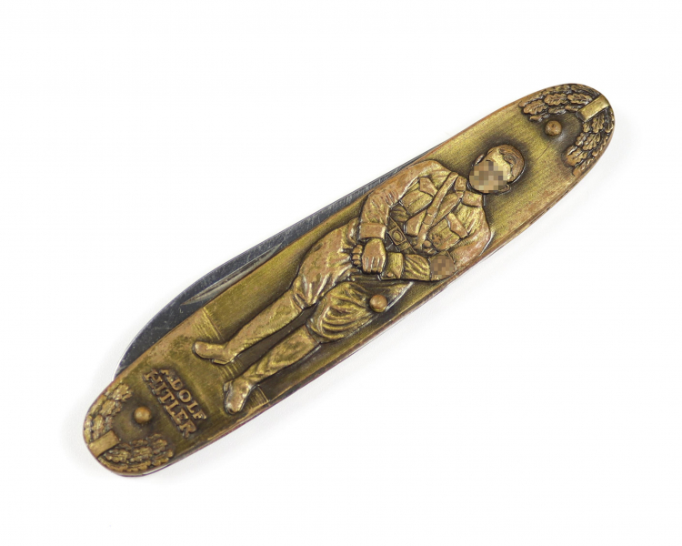 Zweiteiliges Taschenmesser mit Messinggriffschalen, beidseitig mit Reliefmotiven aus der Zeit des Dritten Reiches. Klinge gestempelt "Solingen Germany Stainless".