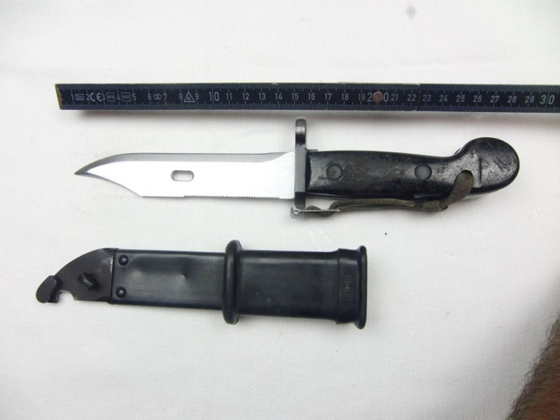 Frühe Variante für die DDR Ausführung der AK 47 in gutem, gebrauchten Zustand. Klinge top, Scheide hat zwei Beulen vom Nahkampf.
