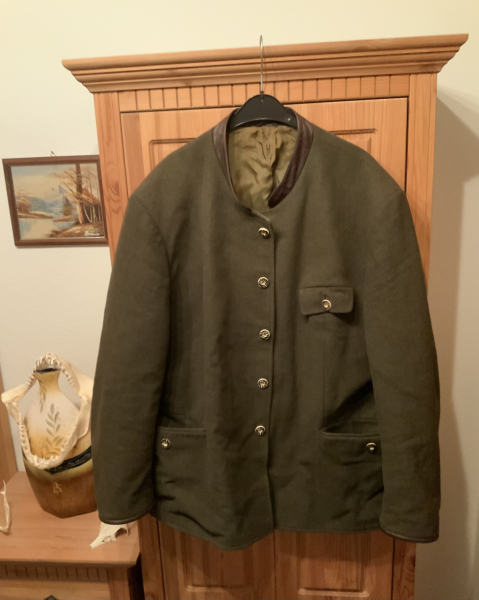 Sie bieten hier auf...1...Janker...von E. Kettner...Gr. 56...gebraucht...keine Löcher...keine Risse...Kragen und Ärmelenden mit braunem Leder verstärkt durch prof. Nähstudio...für die tägl. Jagd im Frühjahr und im Herbst...