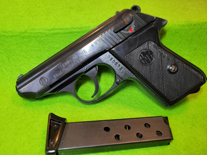 Biete hier eine schöne PPK Replik an, ERMA EGP 75S mit der PTB 69/4. Wie Kenner wissen, besteht der Lauf der Waffe noch komplett aus Stahl mit minimaler Verbauung. Die Waffe ist gebraucht, hat dementsprechend Nutzungsspuren zu verzeichnen. Bitte dazu die Fotos beachten! Die Funktion ist einwandfrei, einen Schusstest habe ich aber mangels Möglichkeiten nicht durchgeführt. Es sind seltene schwarze Erma Griffschalen ohne Ausbrüche oder ähnliches montiert. Die Lieferung erfolgt in einer blauen Plastebox ohne weitreres Zubehör.