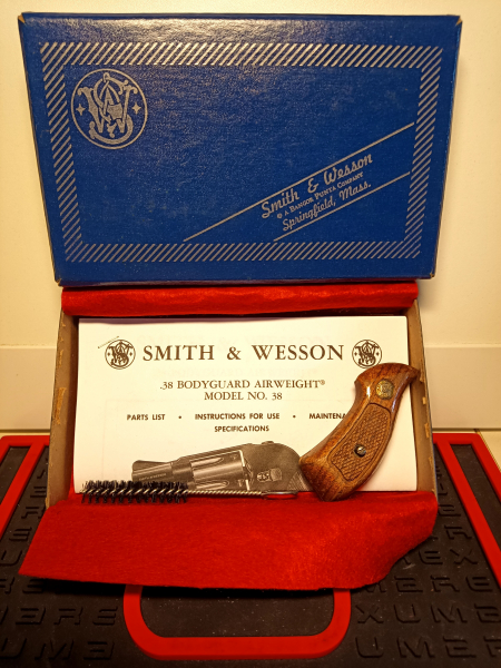 Geliefert wird die OVP, Reinigungsbürste, Filztuch, Handbuch Bodyguard 38, Werbematerial S&W Garantiekarte und ein Satz Echtholzgriffschalen von S&W passend für die Erma EGR 66 oder den Weihrauch HW37