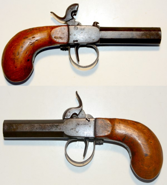 Perkussionspistole, fester Lauf, Lauflänge 61 mm, Gesamtlänge 16 cm, Kaliber 11,5 mm, der Piston ist platt geschlagen. Alterspatina, bis auf Piston technisch guter Zustand