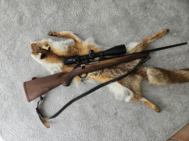 Auf der Waffe ist ein Bushnell Prime 3-12x56 mit Leuchtpunkt verbaut. Die Waffe hat einen Flintenlaufabzug.