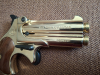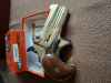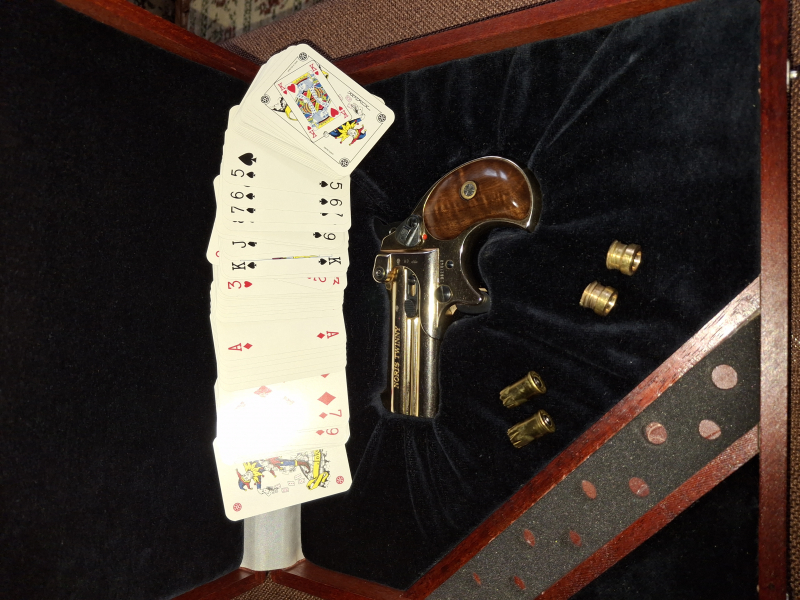 Seltener Noris Twinny Derringer goldfarben in Holzbox mit 2 Mündungsschonern, 2 abgeschossenen Knallpatronen zur Deko oder als Pufferpatronen verwendbar und Mini Kartenspiel;