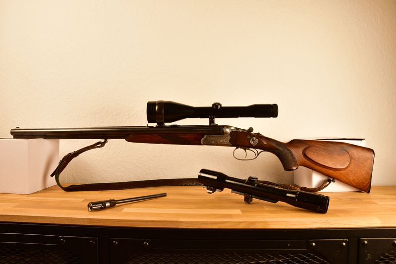 Inklusive zweier Gläser auf widerholgenauer Suhler Einhakmontage. Lichtstarkes Zeiss Diatal-Z in 8x56 für den nächtlichen Sauansitz, sowie variables Hensoldt Diavari 1,5-6x36, beide mit Absehen 1. Leider benötigt das Hensoldt eine Wartung an seiner Verstellung, vermutlich ist das Öl in ihr über die Jahre verharzt.