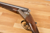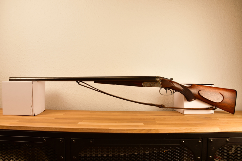 Durch den Ejektor werden geschossene Hülsen beim Öffnen selbstständig ausgeworfen und ein schnelles Nachladen ist gewährleistet. Buntgehärtete Basküle mit Arabeskenmuster, deutsche Schäftung mit Fischhaut und Backe in geölter Ausführung.