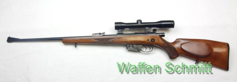 Sie bieten auf eine Repetierbüchse Walther im Kaliber .22Hornet montiert mit Zeiss Diatal-D Zielfernrohr 4x32, Abs.1 montiert mit Suhler Einhakmontage. 56cm Lauflänge mit verstellbarer Visierung ( Lauf von innen ohne Mängel). 11mm Prismenschiene auf der Hülse, Druckknopfsicherung im Schaft, deutscher Stecherabzug, herausnehmbares 4-Schuß Magazin, Nußbaumholzschaft mit deutscher Backe, Riemenbügel, Schaftlänge 37,5cm, Gesamtlänge 103,5cm. Gebrauchsspuren an der Waffe, einwandfreie Funktion!!!