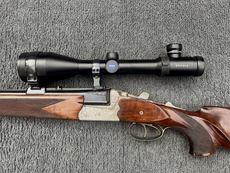 Weiterhin ist auf dem Bockdrilling ein Zielfernrohr des Herstellers “ Zeiss “, mit der Modellbezeichnung “ Variopoint 3-12x56 “ ( mit Leuchtabsehen ) montiert, das mit zum Lieferumfang gehört.