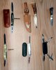 6 Messer / Taschenmesser Teils mit Werbeaufdruck (z.B. das helle Messer: "ARBEITE MIT DEINER GENOSSENSCHAFT") Gebrauchsspuren, Hüllen/Etui teils eingerissen.