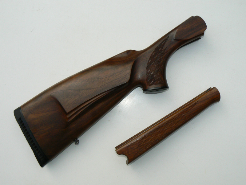 Der Schaft befindet sich im Neuzustand! Er stammt von der Luxusausführung der Büchse und zeigt eine sehr ansprechende Maserung. Ganz wenige, ganz kleine Gebrauchsspuren sind vielleicht mit einer Lupe erkennbar, mit bloßem Auge sieht man nichts. Risse und Ausbrüche sind selbstverständlich nicht vorhanden. Das verwendete Nussbaum-Kernholz ist sehr hart und feinpoorig. Am Schaftende ist eine Gummikappe angebracht. Aufgrund der modernen CNC-Fertigung der Blaser Waffen passt der Schaft ohne Nachbearbeitung an jede Waffe des gleichen Modells. Nicht in der Auktion enthalten sind die Metall-Innenteile (Befestigungsschrauben) des Schaftes, die ich für meinen Carbonschaft verwenden musste.