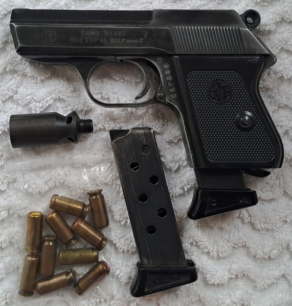 +++ Hersteller: ERMA-Werke / Kaliber: 8 mm K / Munition: Gas- und Platzpatronen / Alter: Etwa 50 Jahre / Kapazität: Magazin für 5 Patronen plus 1 Patrone im Lauf / Abzug: Erster Schuss Single-Action, nachfolgende Schüsse Double-Action / Gewicht: Etwa 390 Gramm / Laufsperre: Ab der Mündung einwärts nach ca. 10 mm, von außen kaum sichtbar - sog. "Scharfe Mündung" / Stempelungen linke Seite: PTB 146; ERMA-WERKE; Mod. EGP 65 Kal. 8 mm K, Bundesadler; Wappen; 76, 002473 / Stempelungen rechte Seite: Made in W. Germany / Beschusstest: Keiner / Trockentest: Patronen werden problemlos eingeschoben und ausgeworfen; Single- und Doubleaction funktionieren; Schlagbolzen beweglich; Schlitten beweglich; alle weiteren Teile auch beweglich; alles rastet gut ein und aus; keine Fehlfunktionen; augenscheinlich voll funktionsfähig / Zustand technisch: Guter bis sehr guter gebrauchter Zustand / Zustand optisch: Brünierung teilweise abgerieben aber keine Katscher / Brünierung: Schwarz / Lieferumfang: Pistole; Magazin; Ersatzmagazin; Schießbecher; 10 sehr alte Gaspatronen / Verpackung und Bedienungsanleitung: Nicht mehr vorhanden / Empfehlungen: Handliche und als Selbstverteidigungswaffe geeignete Taschenpistole; Spaß an Sylvester; Sammlerstück. / Verkauf und Versand: Nur Deutschland; keine Inseln. +++