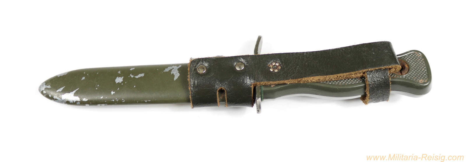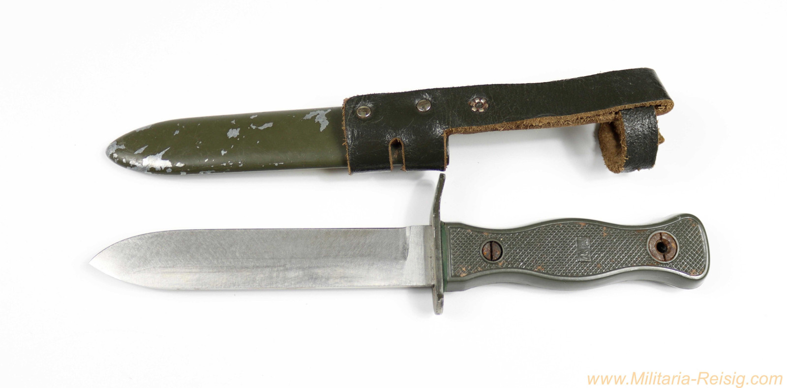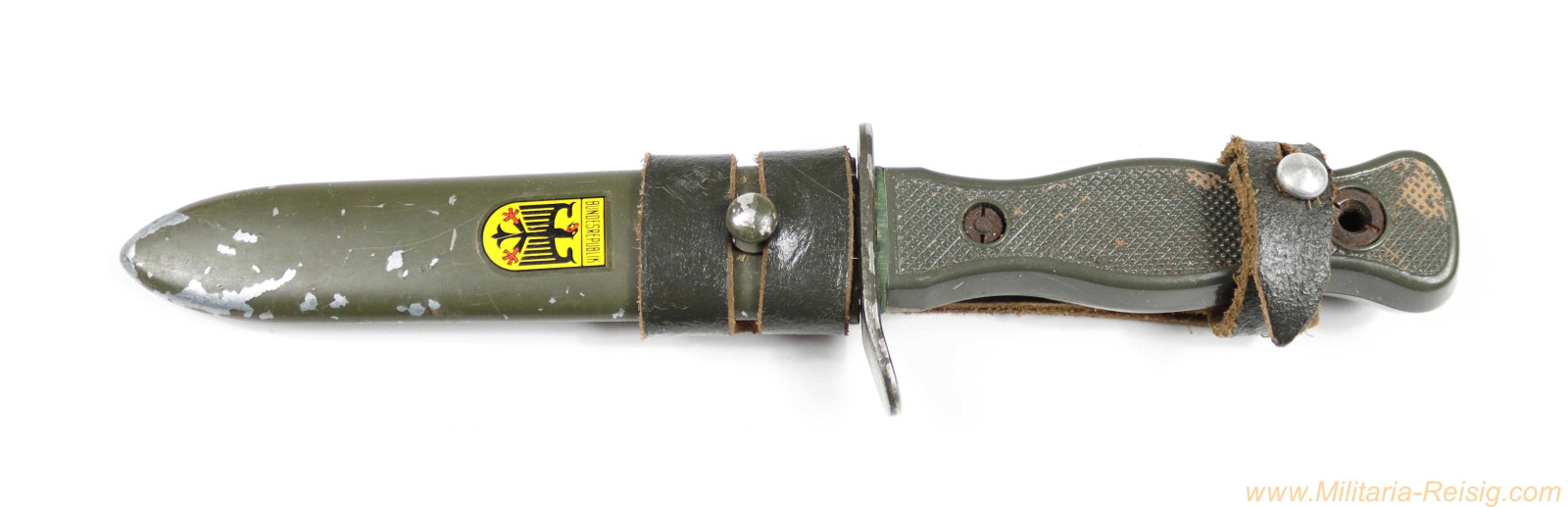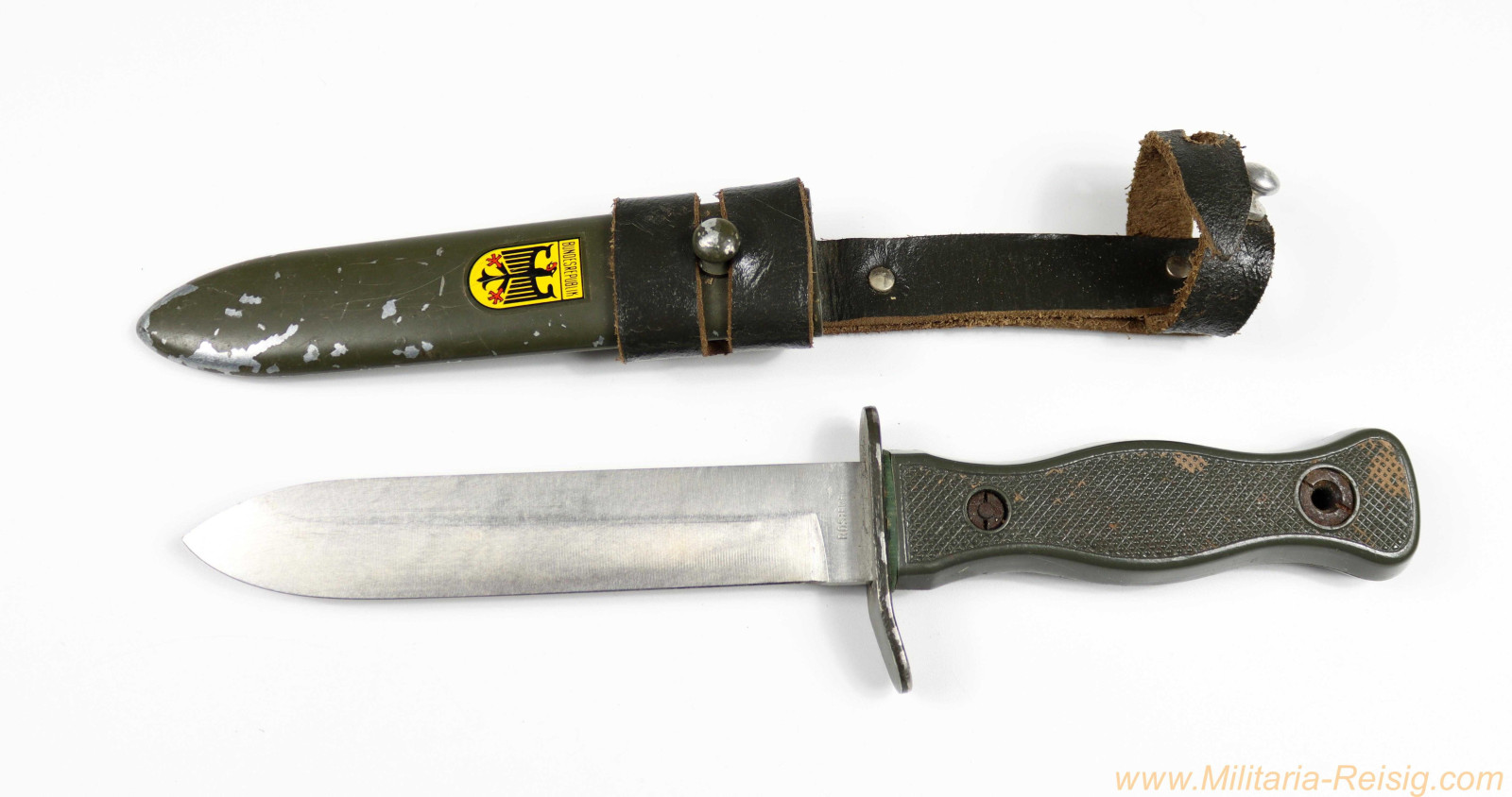Bundeswehr Kampfmesser mit beidseitig geschliffener Klinge und olivfarbenem Kunststoffgriff. Griffe verschraubt, Klinge markiert.