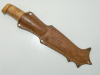 Aus meiner Sammlung verkaufe ich ein fast neuwertiges Jagdmesser (sog. Puukko) von Marttiini aus Finnland. Ich habe das Messer aus einem Nachlass bekommen, es liegt seither mit zu vielen anderen schönen Exemplaren in der Vitrine. Der Vorbesitzer hat es nicht oder nur sehr behutsam benutzt. Auf der Klinge klebt noch ein Etikett, dessen Aufschrift ich allerdings nicht mehr vollständig entziffern kann. Die Messerscheide zeigt keinerlei Schäden oder Gebrauchsspuren, sie wurde offensichtlich nicht ganz trocken gelagert und besitzt einige leichte Wasserflecken, die allerdings mit Schuhcreme oder Lederfett beseitigt werden können. Das Messer selbst sieht aus wie neu. Die Klinge ist knapp 15 cm lang, 1,8 cm hoch und ungefähr 3 mm stark. Sie ist superscharf geschliffen und oberflächlich auf Hochglanz poliert. Wie üblich ist auf einer Seite der Name des Herstellers eingraviert