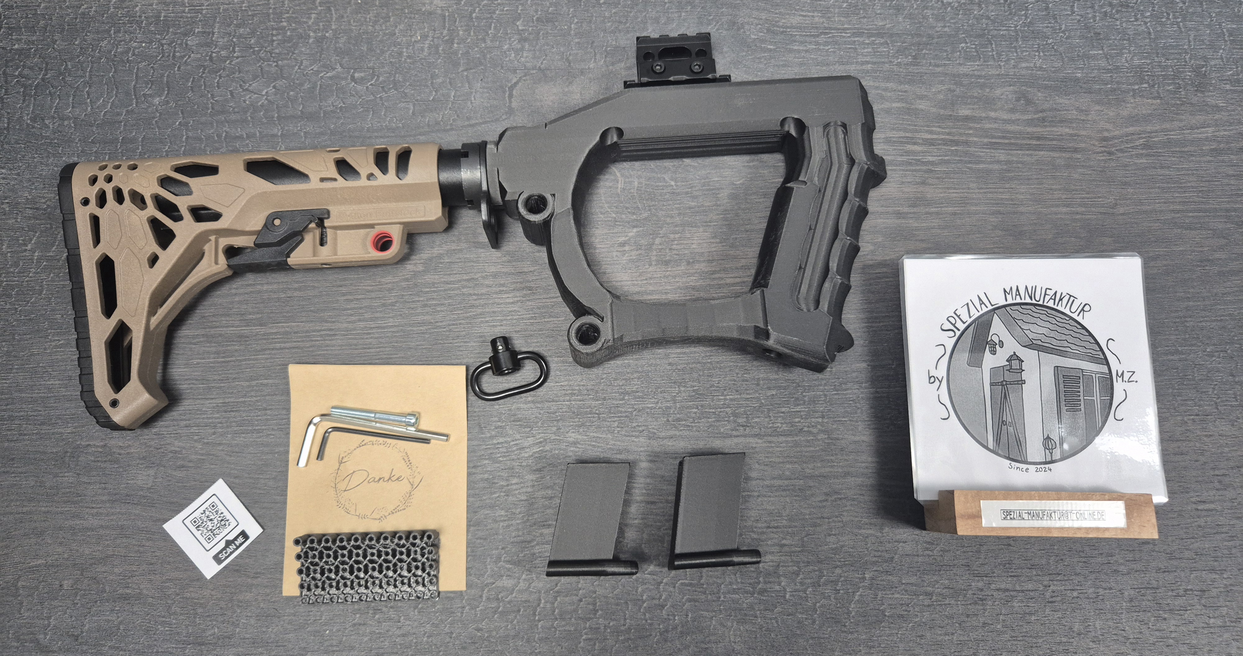 Der Hinterschaft ist hierbei mit allen der AR 15 Serie verfügbaren Schäfte kompatibel und könnte getauscht werden. Der mitgelieferte Ladehebel wird einfach gegen den Originalen ausgetauscht werden. Dieser rastet mittels Druckkugel ein und wird somit fixiert. Ein schnelles durch Laden ist somit Lageunabhängig, jederzeit möglich und sicher.