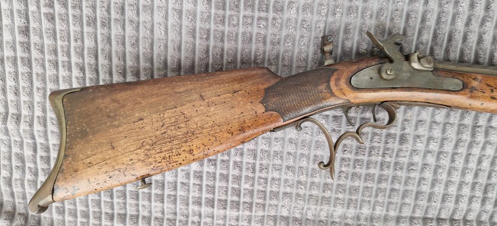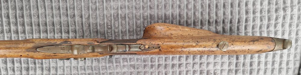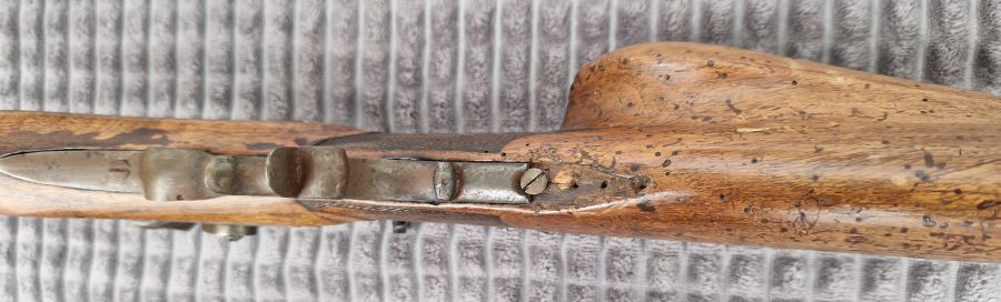 Nussholzschaft mit geschlossenen Wurmlöchern.