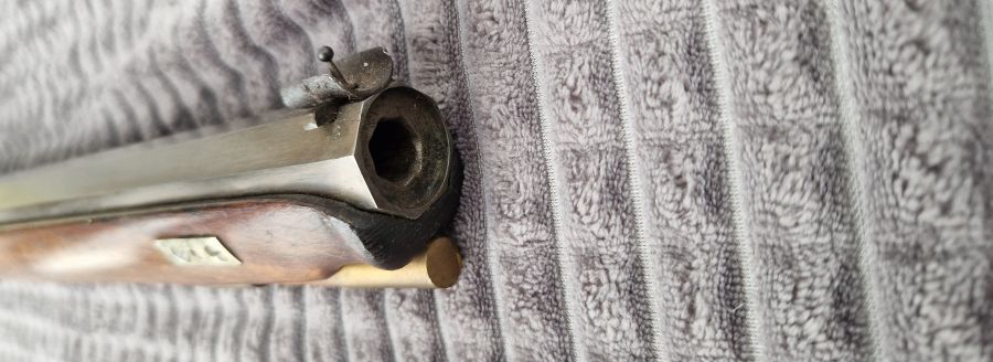 Laufoberseite Herstellersignatur, seitlich eingeschlagene Marke. Hinterdrehte Mündung. Cal. 10.5 mm. Gut gezogen.