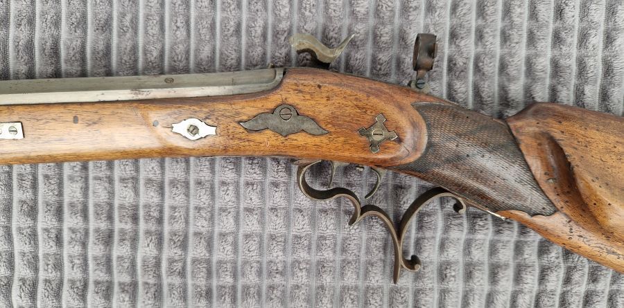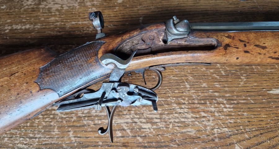 Perkussionsbüchse 19.Jh., Cal. 10,5 mm gezogen, signiert, Stecher, Diopter usw.