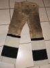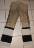 Trapperhose aus Hirschleder, dicke Qualität, gute alte Patina. Größe sollte einer 33-30 bis 34-30 entsprechen, ausreichend für Träger bis 90 Kg bei 1,81 Gesamtlänge, so war zumindest der Letzte. Die Beinlinge sind neu angesetzt worden und waren früher durchaus üblich, da Stoff oder wie in diesem Falle Wolle (Handelsdecke) schneller trocknet.