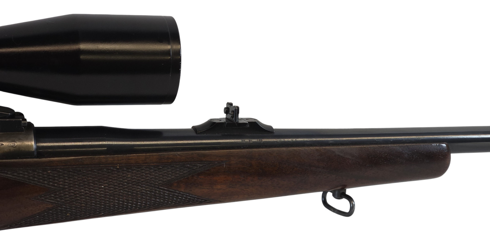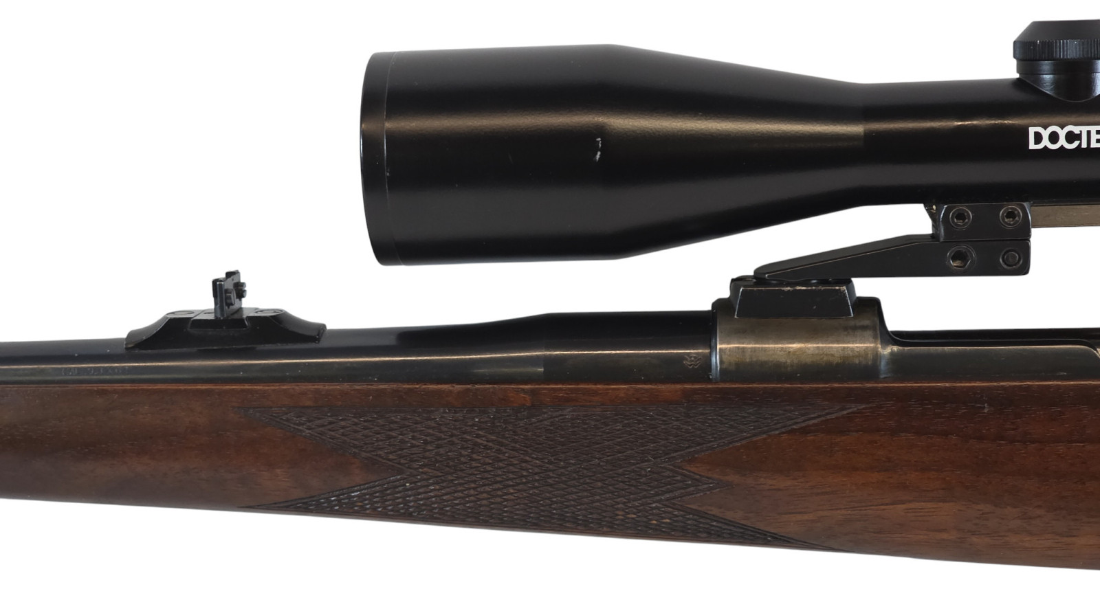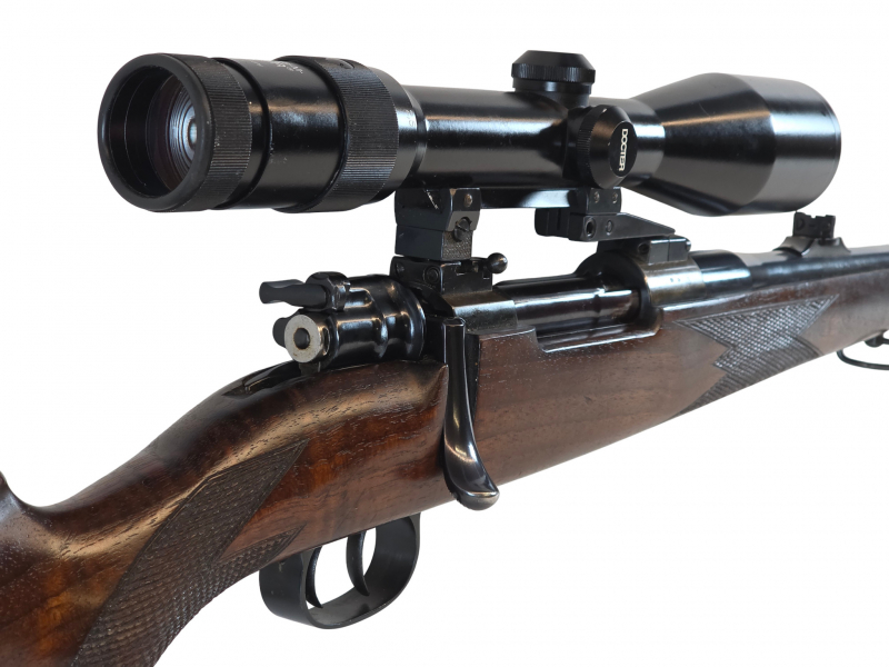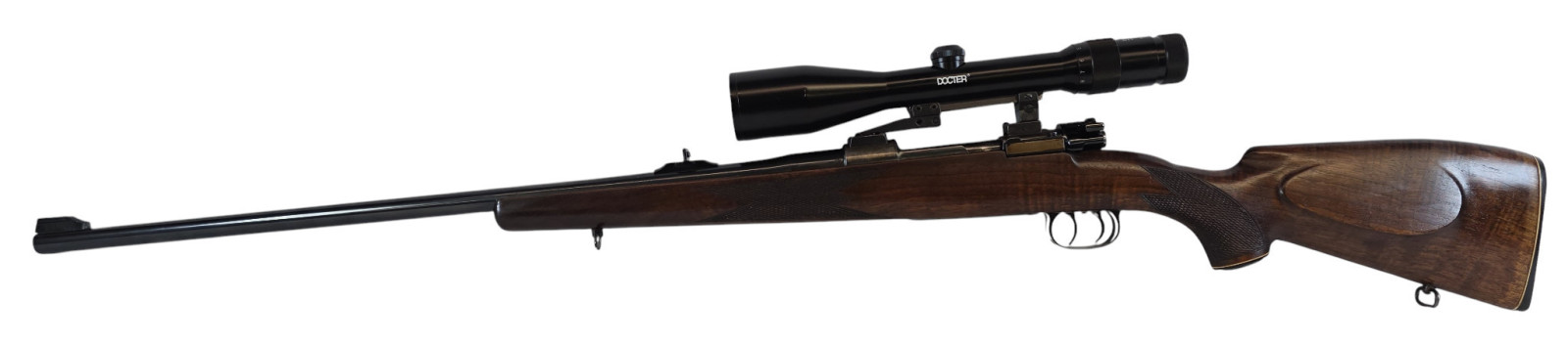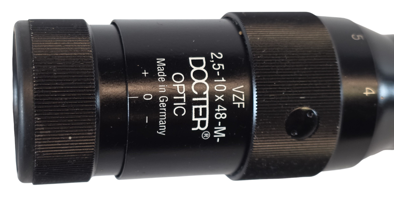 Optik: Kimme und Korn mit Glas Docter VZF 2,5-10x48 Abs. 4 auf Schwenkmontage.