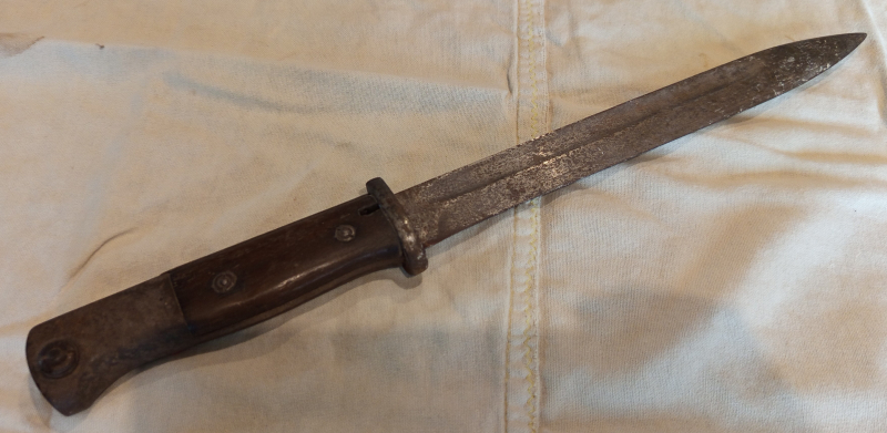 Bajonett Wehmacht K98, gestempelt mit 9124a, Klinge 25 cm, Gesamt ca. 38 cm, Zustand siehe Fotos.