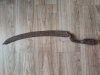 Biete hier eine Bauernwaffe Kriegssense unbestinmten Alters an. Sie ist ca. 78 cm lang und grob geschmiedet. Patina und Färbung des Stahls weisen auf ein höheres Alter hin. Nur die Spitze ist "scharf", die Schneiden sind stumpf. Auf dem Blatt befinden sich vier Zeichen (Schmiedemarken?).