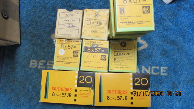 Sie bieten auf ein Munitionskonvolut im Kaliber 8x57JR; der Lieferumfang entspricht der Abbildung. Es ist möglich, dass vereinzelte Patronen bereits Lagerspuren haben (leichte Lagerspuren, wenn überhaupt, kein Grünspan oder so); einzelne Packungen sind nicht voll und ich will auch nicht ausschließen, dass zwischendurch eine Patrone mit einem anderen Geschoss dazwischen ist als auf der Packung steht. . Bitte keine Nachfragen, welche Packungen voll sind und welche angebrochen; wer das wissen möchte, kann gerne gucken kommen. Das ist ein Privatverkauf; keine Garantie, Gewährleistung, Rücknahme.