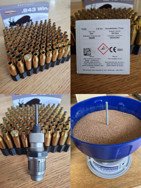 Hülsen wurden In einem Tumbler mit Walnussschalengranulat der Körnergrößen 0,8-1,4 mm schonend gereinigt, auf einer neuen RCBS .243 VL Matritze vollkalibriert und mit einem Zündhütchen large rifle RUAG Typ 5341 gezündert.