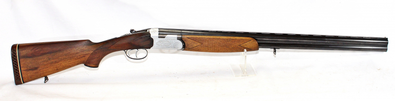 Die Flinte befindet sich in einem sehr guten Zustand. Komplett gravierte, absolut dichte Basküle mit dem bewährten Flankenverschluss. Doppelabzug. Blanke, 71cm lange Läufe mit Halb- und Vollchoke. Ejektoren. Nussbaumschaft mit Fischhaut, ventilierte Schaftkappe und Deutscher Backe.