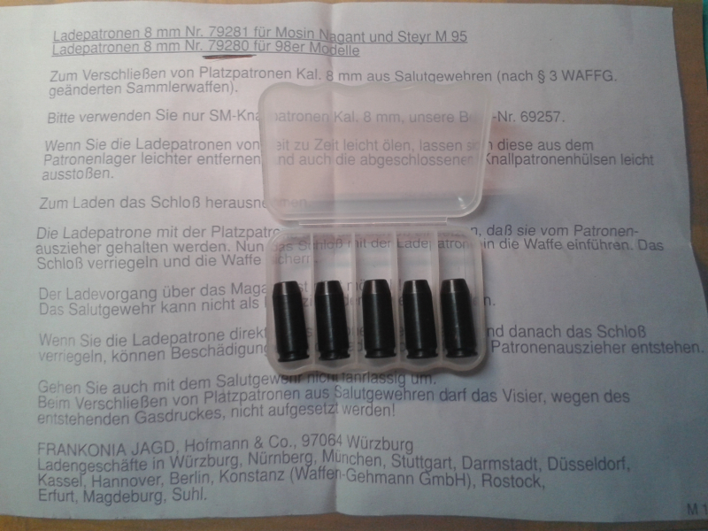 Hallo, ich verkaufe hier sehr seltene Ladepatronen Adapter-Patronen Salut 5 Stück für 98er Modelle Top Zustand Neu unbenutzt siehe Bilder, werden so wie gesehen verkauft. Die Ladepatronen sind aus Stahl und bruiniert. Mit Kopie einer Gebrauchsanweisung ++++++++++++++++++++++++++++++++++++++++++ Dieses ist ein Privatverkauf somit keine Garantie, keine Gewährleistung und keine Rücknahme. Keine nachträgliche Minderung des Kaufpreis.+++++++++++++++++++++++++++++++++Viel Spass damit. Frei ab 18 Jahre, bitte nach dem Kauf per eMail den Altersnachweis (kopie vom Personalausweis Vorder-u. Rückseite zusenden), auch von ID Mitgliedern.+++++Achtung!!!!!!------kein internationaler Versand, Verkauf nur in Deutschland.-----!!!!!!!!++++++++Achtung, Preis gesenkt.++++++++++++++++++++