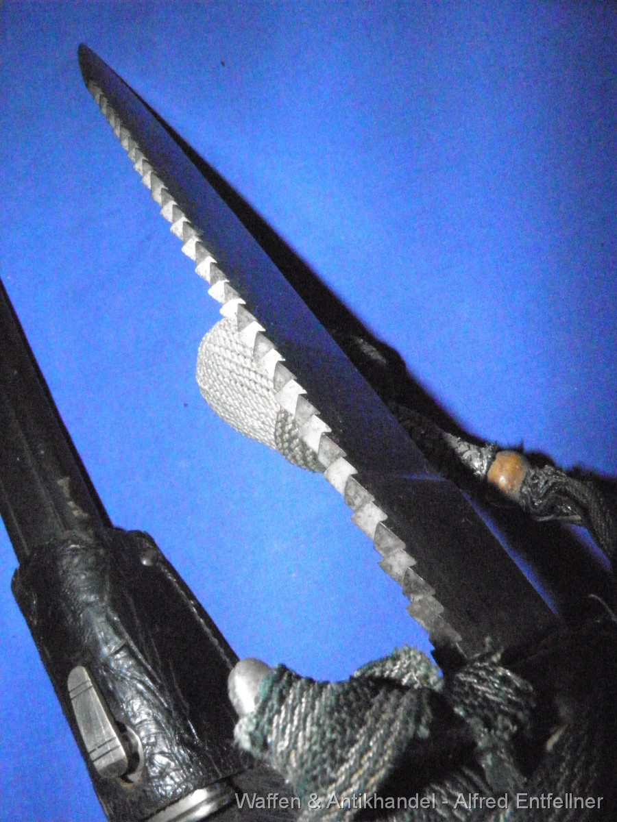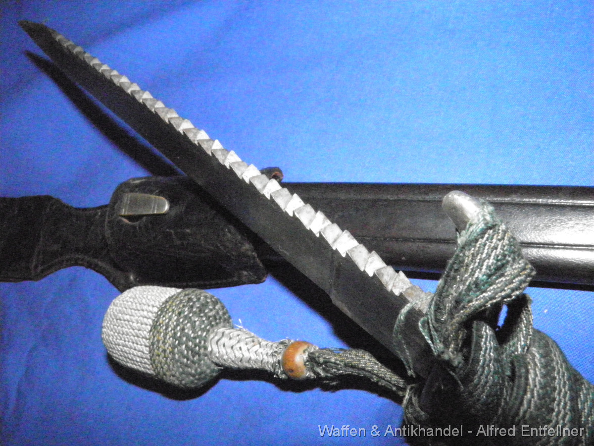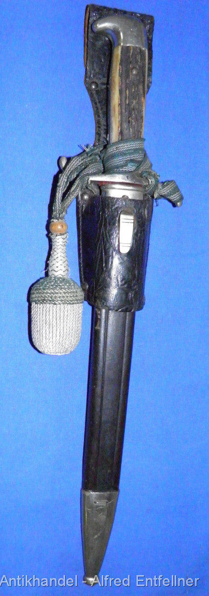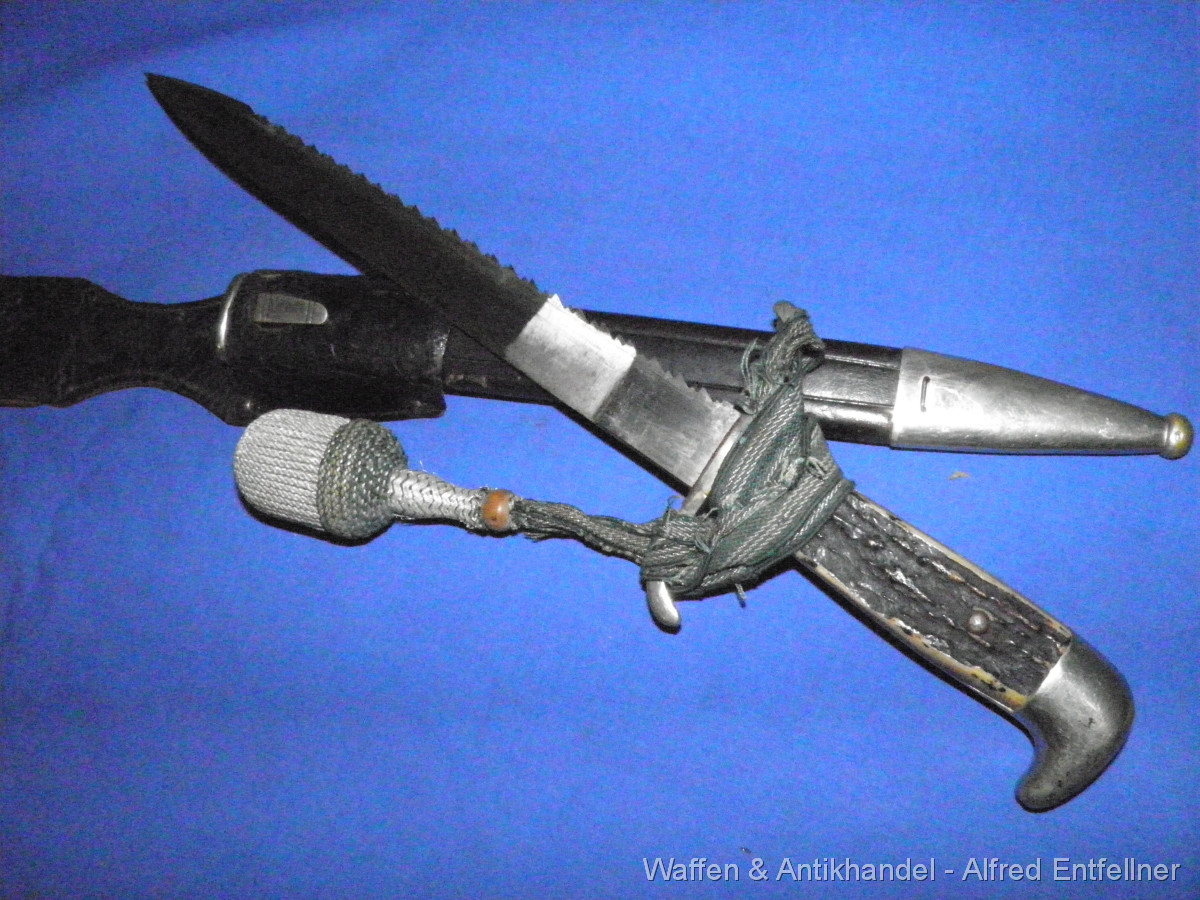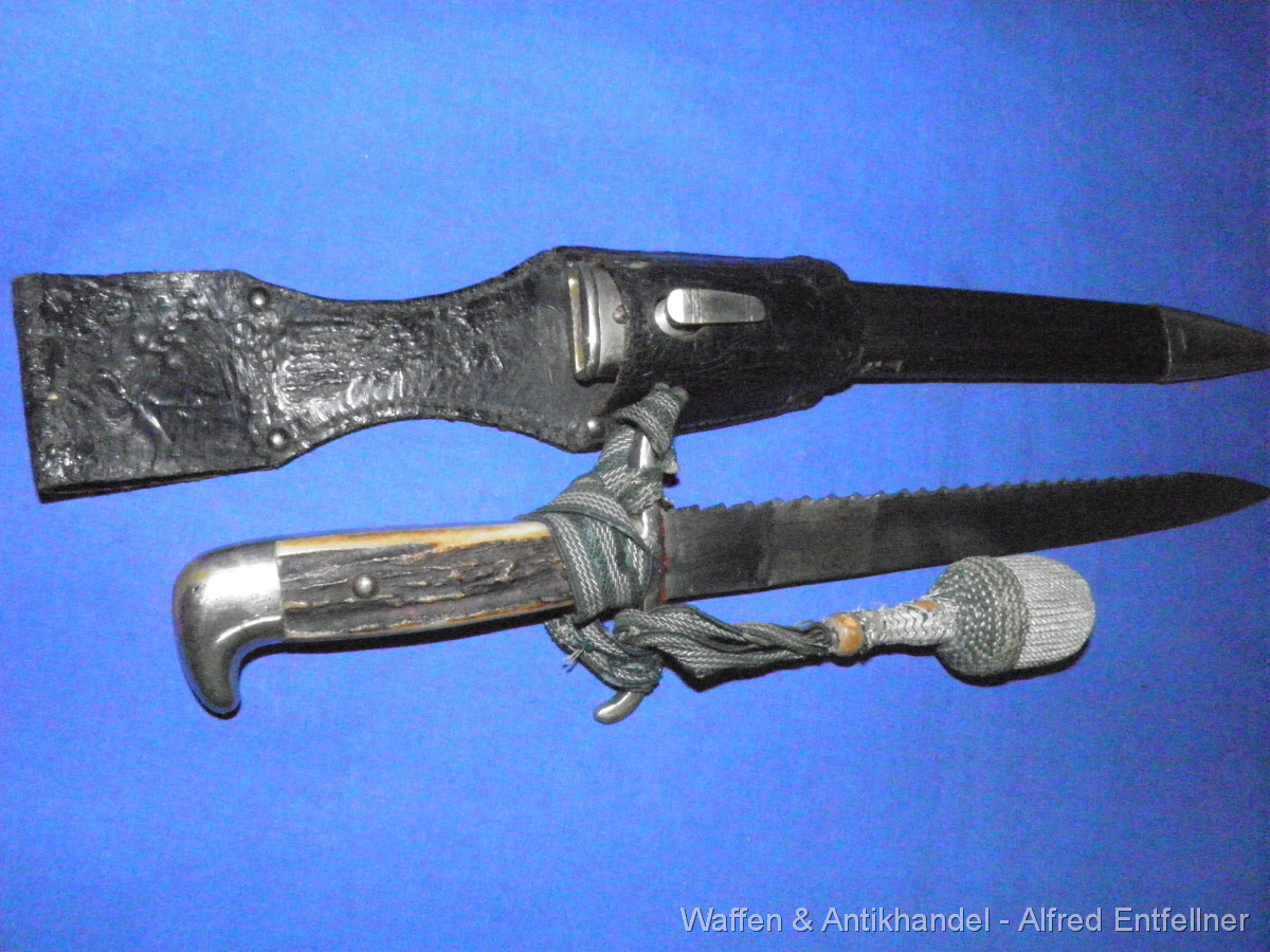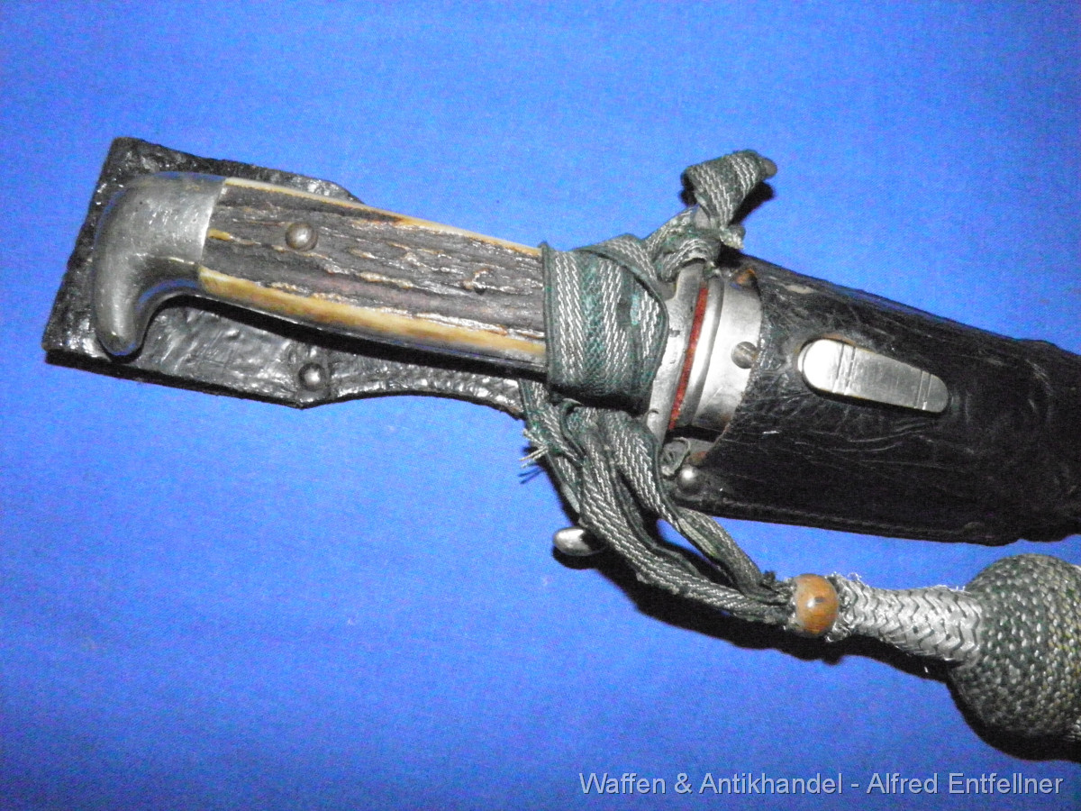 Massiver Deutscher Hirschfänger, Prima Zustand, schöne Sägerückenklinge. Kein Hersteller ersichtlich. Lederscheide guter Zustand, Hirschhorngriff - Griffteile vernickelt.
