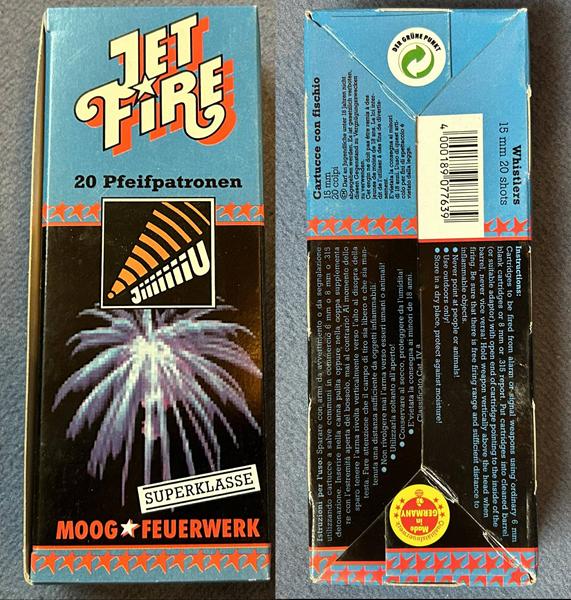 Verkaufe hier eine Schachtel der alten Moog Feuerwerk Jet Fire Pfeifpatronen. Es sind 20 Feuerwerksgeschossen enthalten.