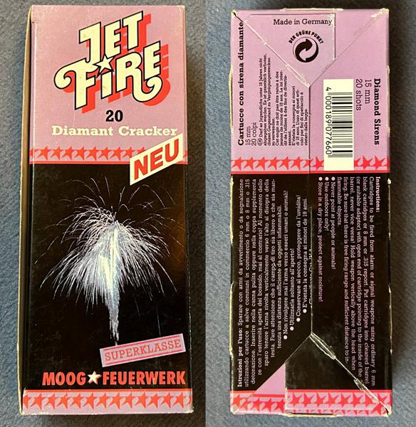 Verkaufe hier eine Schachtel der alten Moog Feuerwerk Jet Fire Diamant Cracker. Es sind 20 Feuerwerksgeschossen enthalten.
