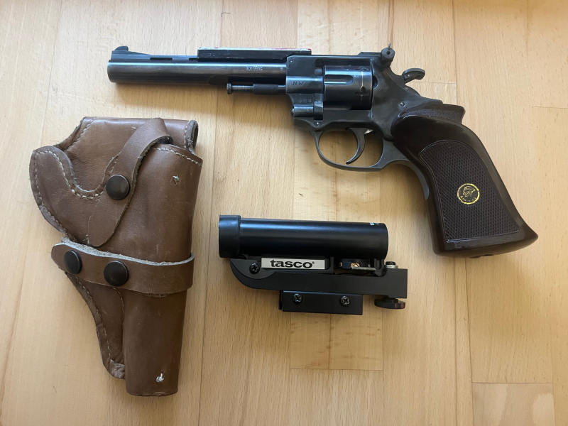 Mit nachträglich angebrachter Laufschiene (rückbaubar),Tasco Reddot und Holster. Teilweise abgegriffen ohne große Kratzer oder Schäden. Lauf und Trommelbohrungen in gutem ustand, wenig geschossen. Hervorragende Präzision.