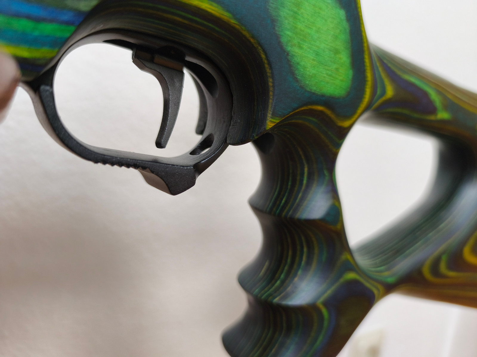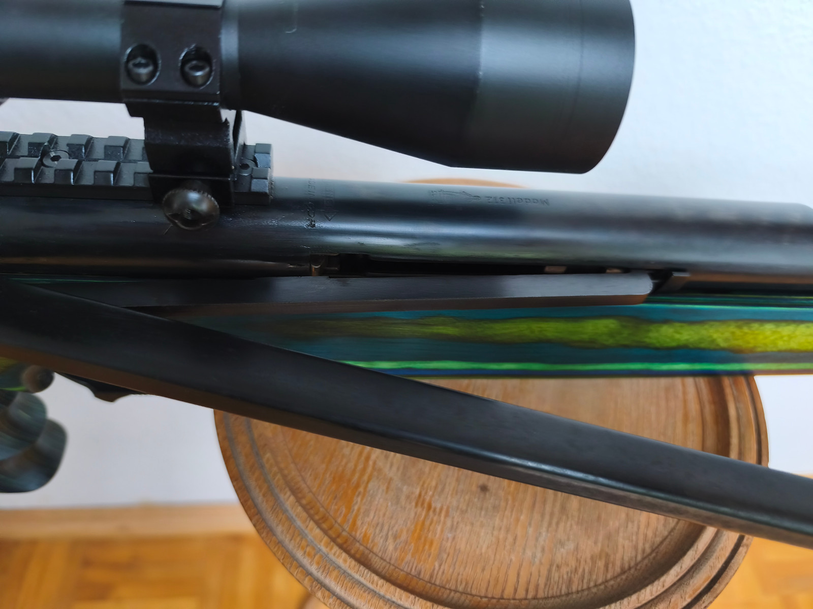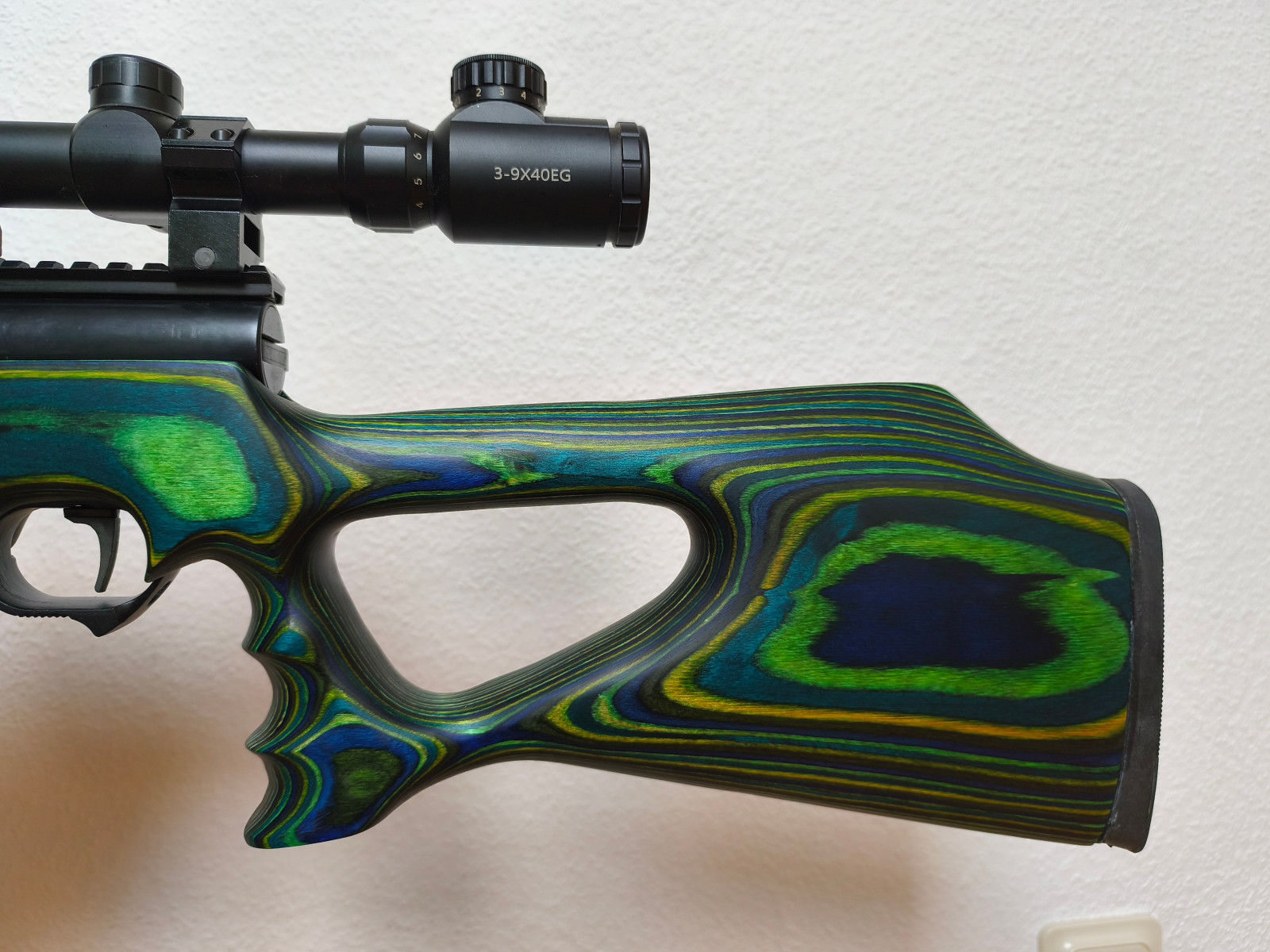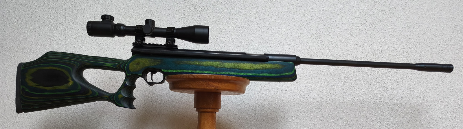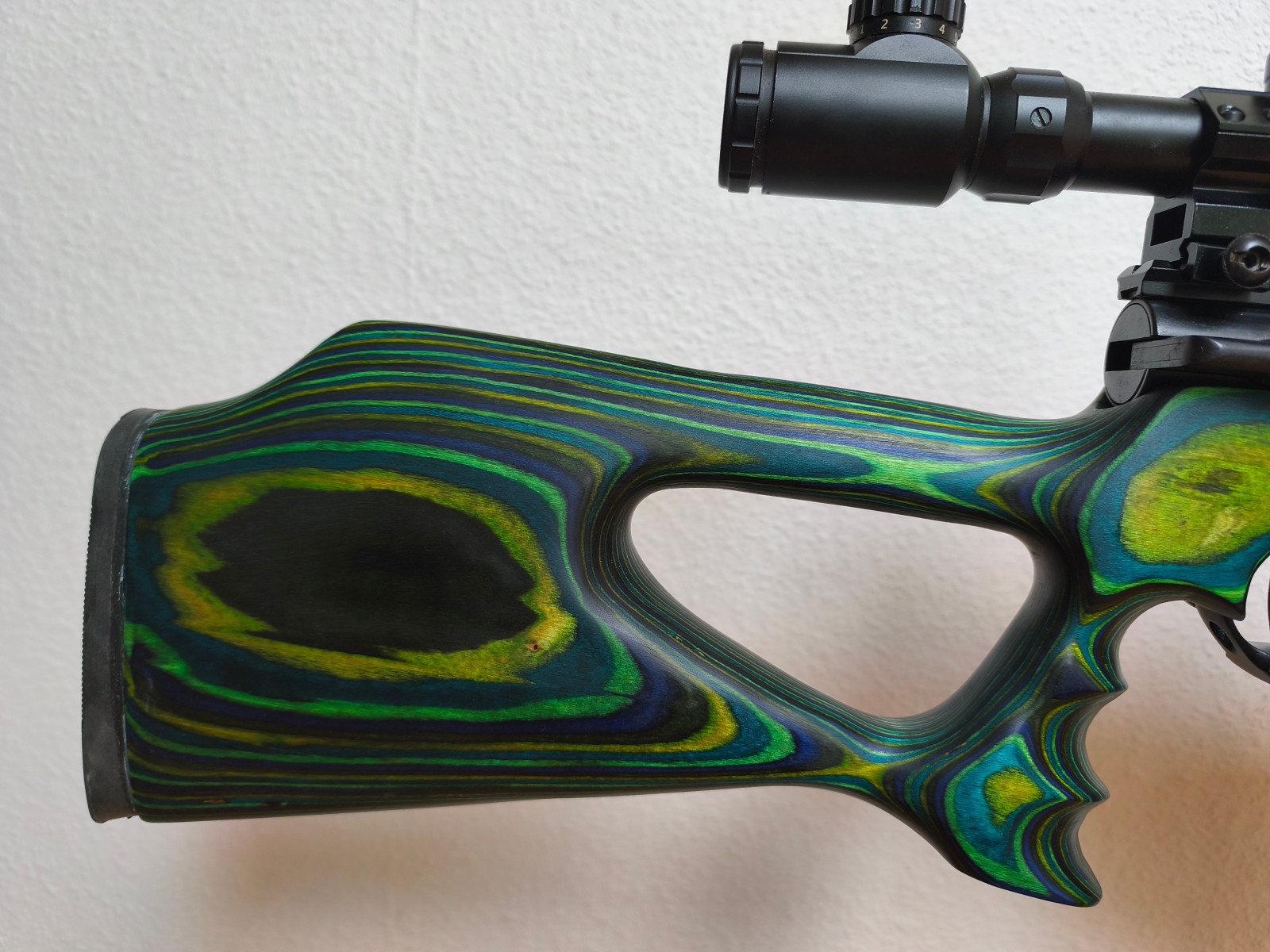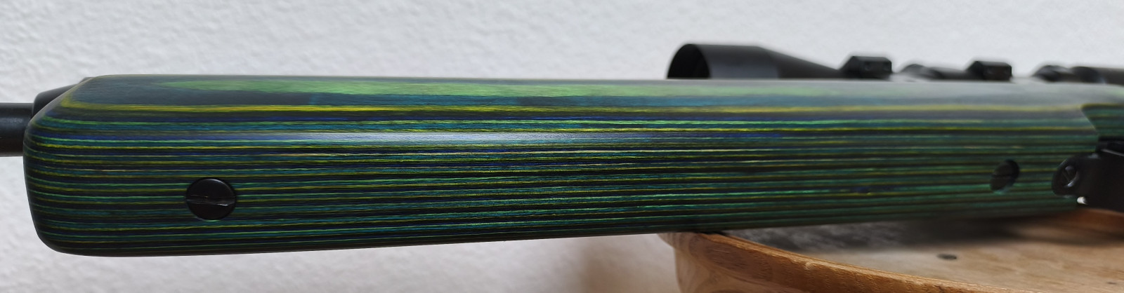 Der Schaft vom Gewehr ist aus hochverpressten, gefärbten und geharztem Schichtholz gefertigt.Bleibt noch zu erwähnen, dass der Schaft ein handgefertigtes Einzelstück ist.
